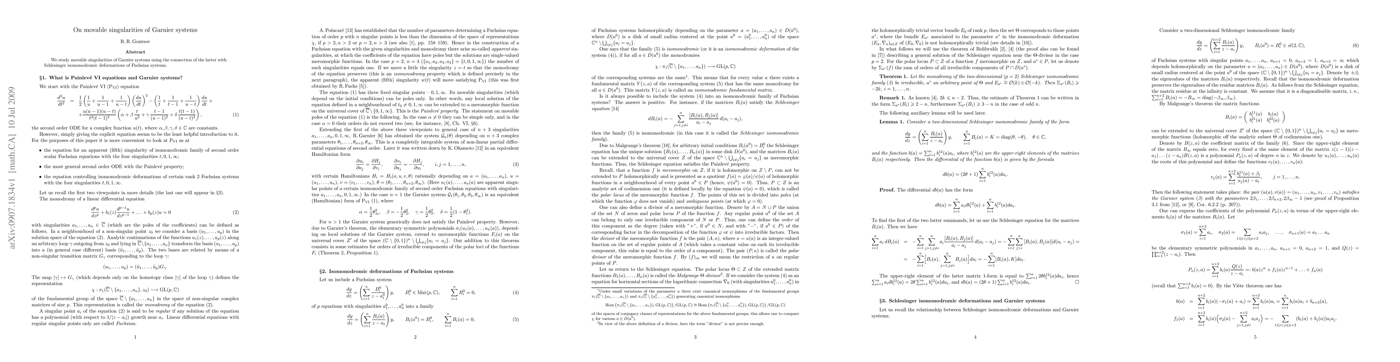 Summary: This paper investigates the nature of movable singularities in Garnier systems, linking them to Schlesinger isomonodromic deformations of Fuchsian systems to better understand their behavior.