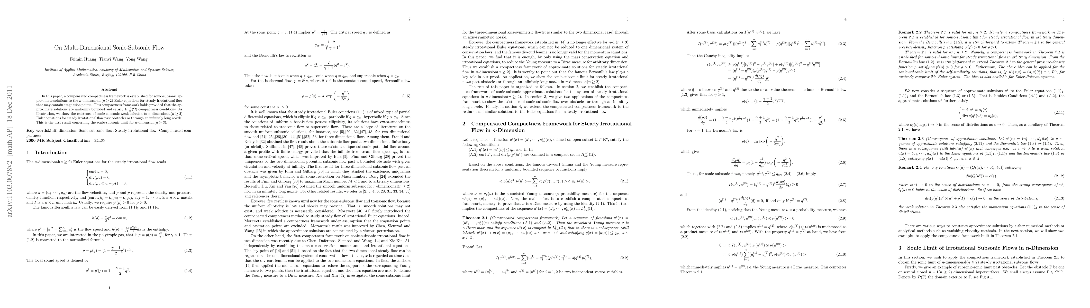 This paper establishes a compensated compactness framework for sonic-subsonic solutions to the $n$-dimensional Euler equations, demonstrating the existence of such solutions past obstacles or through nozzles, marking the first result for $n \geq 3$ dimensions.