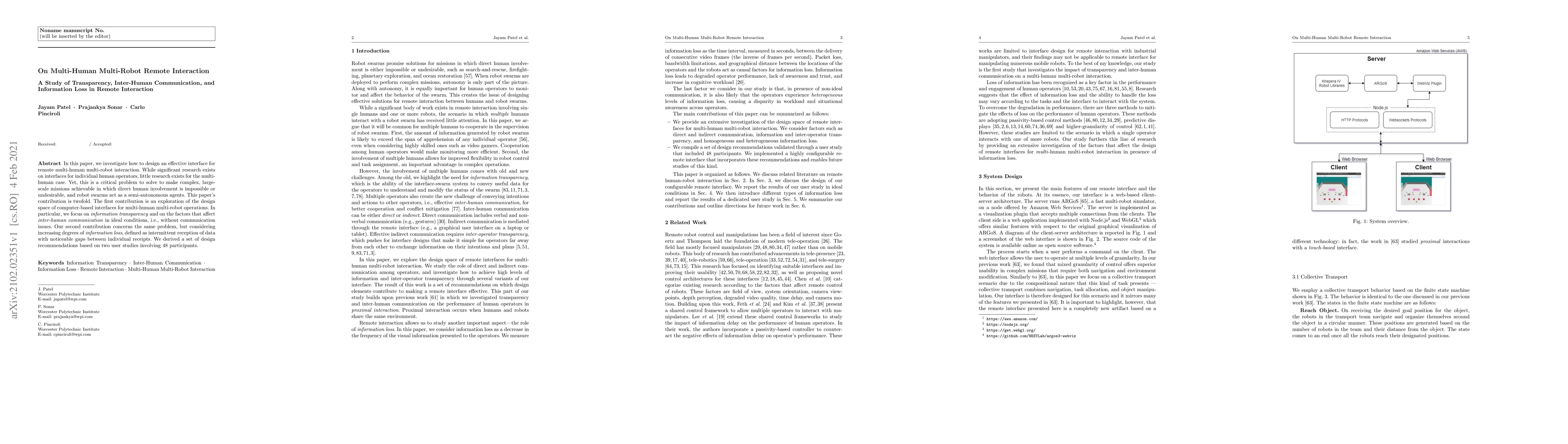 This paper explores the design of interfaces for multi-human multi-robot remote interaction, focusing on transparency, inter-human communication, and the impact of information loss. It provides design recommendations based on user studies, highlighting factors that enhance communication and mitigate information loss in remote operations.