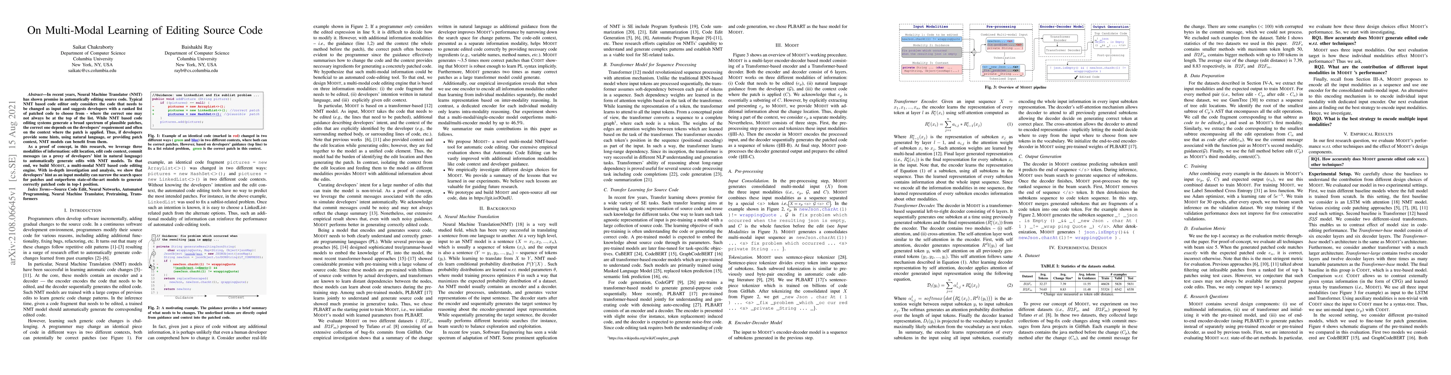 This research explores multi-modal learning for automatically editing source code using Neural Machine Translators (NMT). The study introduces MODIT, a multi-modal NMT-based code editing engine, which incorporates edit location, code context, and commit messages to generate more accurate patches, demonstrating improved performance over existing models.