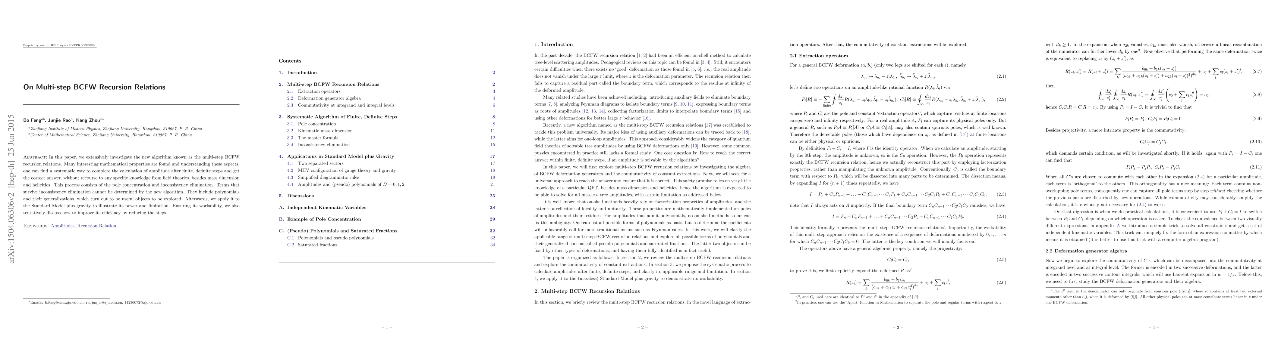 In this paper, we extensively investigate the new algorithm known as the multi-step BCFW recursion relations. Many interesting mathematical properties are found and understanding these aspects, one can find a systematic way to complete the calculation of amplitude after finite, definite steps and get the correct answer, without recourse to any specific knowledge from field theories, besides mass dimension and helicities. This process consists of the pole concentration and inconsistency elimination. Terms that survive inconsistency elimination cannot be determined by the new algorithm. They include polynomials and their generalizations, which turn out to be useful objects to be explored. Afterwards, we apply it to the Standard Model plus gravity to illustrate its power and limitation. Ensuring its workability, we also tentatively discuss how to improve its efficiency by reducing the steps.
