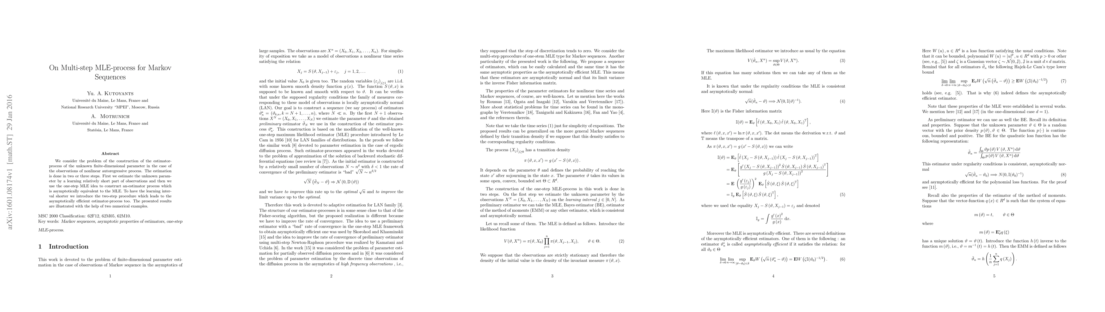 The paper presents a two-step Maximum Likelihood Estimation (MLE) process for estimating unknown parameters in nonlinear autoregressive processes using observations. It introduces a preliminary estimator followed by a one-step MLE idea to construct an estimator-process asymptotically equivalent to the MLE, with the learning interval optimized for computational efficiency.