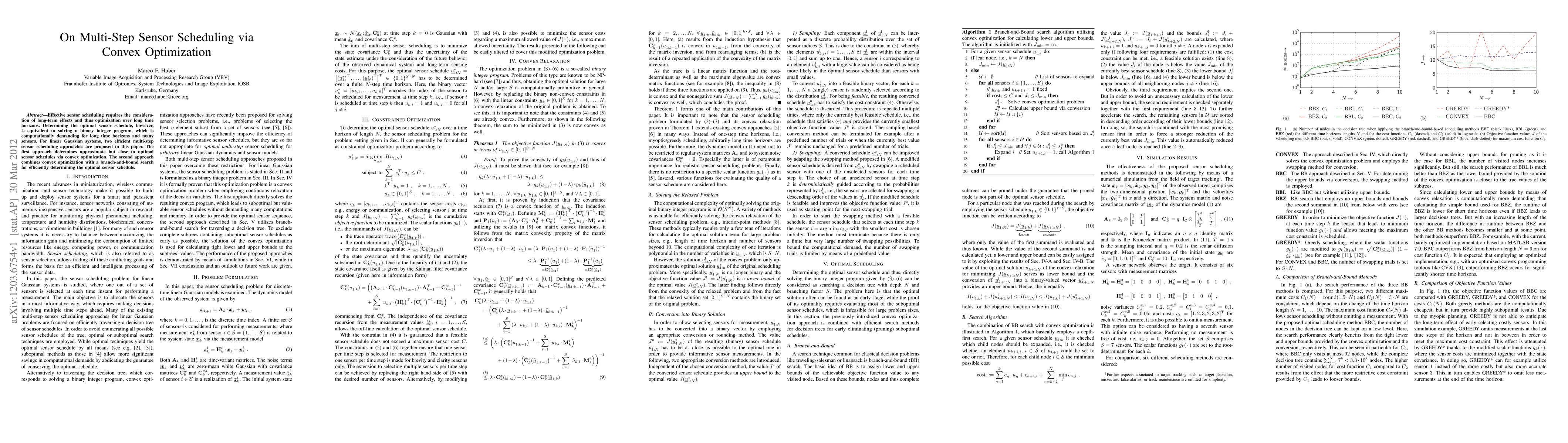 This paper proposes two efficient multi-step sensor scheduling methods for linear Gaussian systems. The first uses convex optimization for near-optimal schedules, while the second combines convex optimization with a branch-and-bound search to determine the optimal schedule.