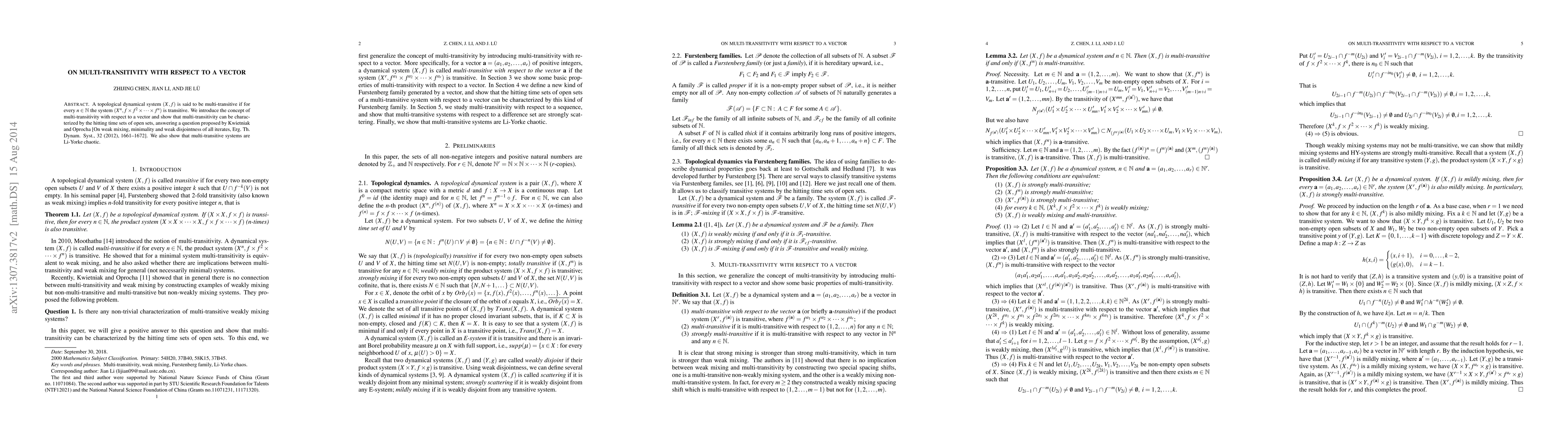 This paper introduces the concept of multi-transitivity with respect to a vector in topological dynamical systems, demonstrating its characterization via hitting time sets of open sets. It further establishes that multi-transitive systems exhibit Li-Yorke chaos.
