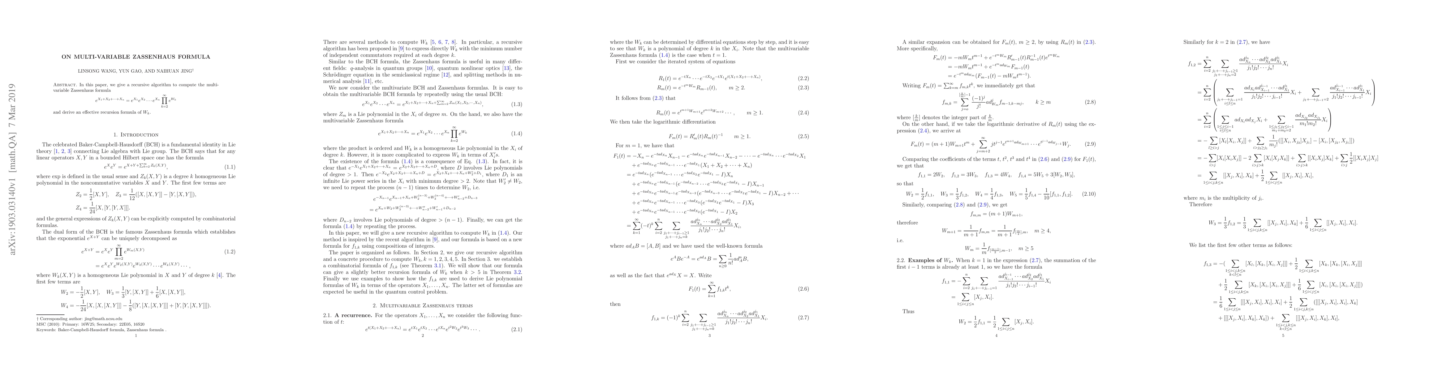 The paper presents a recursive algorithm to compute the multivariable Zassenhaus formula, which expresses the product of exponentials as a nested product of exponentials and an infinite series, along with a derived recursion formula for the terms in this series.
