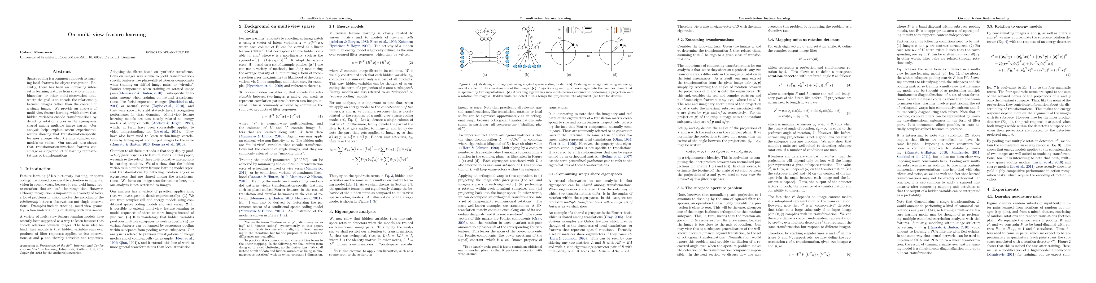 Sparse coding is a common approach to learning local features for object recognition. Recently, there has been an increasing interest in learning features from spatio-temporal, binocular, or other multi-observation data, where the goal is to encode the relationship between images rather than the content of a single image. We provide an analysis of multi-view feature learning, which shows that hidden variables encode transformations by detecting rotation angles in the eigenspaces shared among multiple image warps. Our analysis helps explain recent experimental results showing that transformation-specific features emerge when training complex cell models on videos. Our analysis also shows that transformation-invariant features can emerge as a by-product of learning representations of transformations.