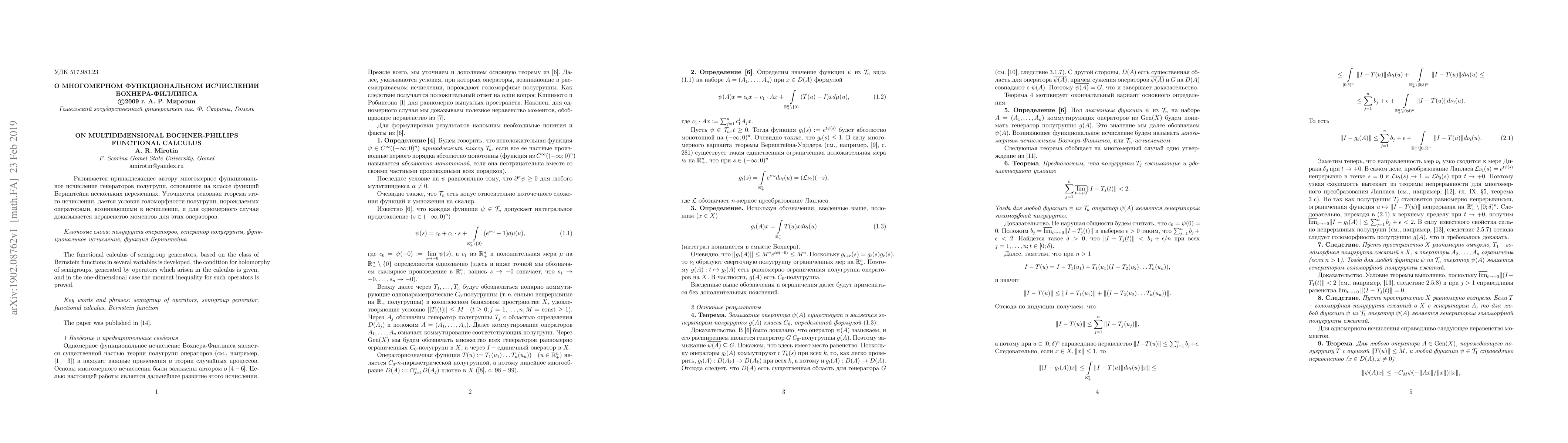 This paper develops a multidimensional Bochner-Phillips functional calculus based on Bernstein functions, provides conditions for holomorphy of generated semigroups, and proves a moment inequality in the one-dimensional case.