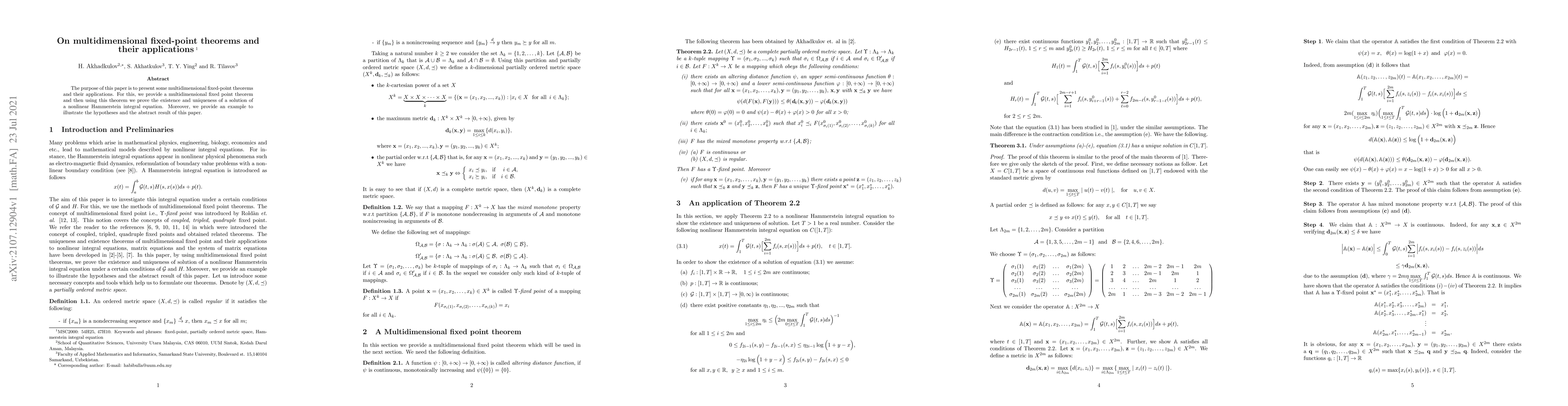 The paper introduces a multidimensional fixed-point theorem for partially ordered complete metric spaces and applies it to prove the existence and uniqueness of solutions for nonlinear Hammerstein integral equations.