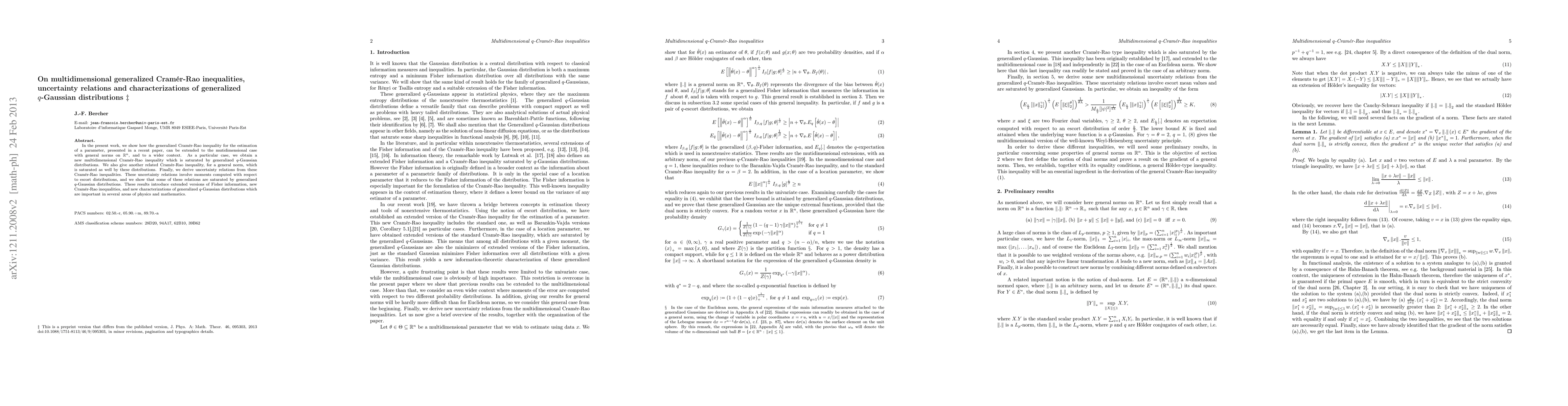 This paper extends the generalized Cramér-Rao inequality to multidimensional cases with general norms and derives new uncertainty relations. It characterizes generalized $q$-Gaussian distributions, which are significant in physics and mathematics, as saturators of these inequalities.
