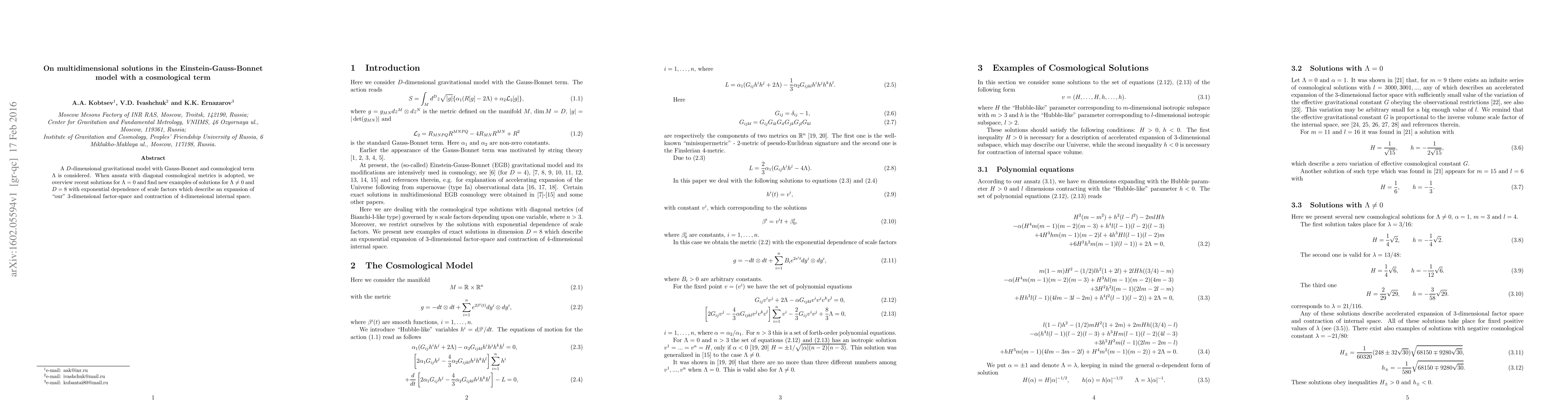 A D-dimensional gravitational model with Gauss-Bonnet and cosmological term is considered. When ansatz with diagonal cosmological metrics is adopted, we overview recent solutions for zero cosmological term and find new examples of solutions for non-zero cosmological term and D = 8 with exponential dependence of scale factors which describe an expansion of our 3-dimensional factor-space and contraction of 4-dimensional internal space.