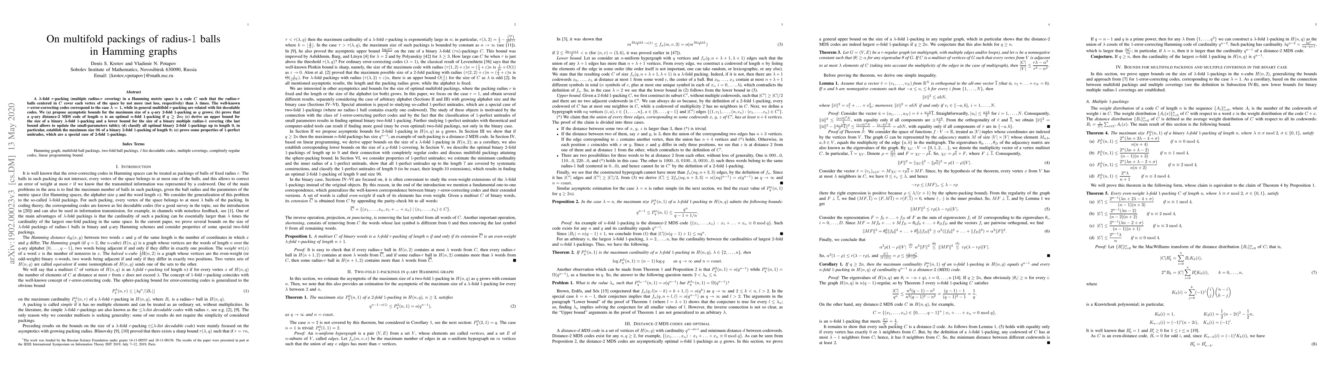 A $\lambda$-fold $r$-packing (multiple radius-$r$ covering) in a Hamming metric space is a code $C$ such that the radius-$r$ balls centered in $C$ cover each vertex of the space by not more (not less, respectively) than $\lambda$ times. The well-known $r$-error-correcting codes correspond to the case $\lambda=1$, while in general multifold $r$-packing are related with list decodable codes. We (a) propose asymptotic bounds for the maximum size of a $q$-ary $2$-fold $1$-packing as $q$ grows; (b) prove that a $q$-ary distance-$2$ MDS code of length $n$ is an optimal $n$-fold $1$-packing if $q\ge 2n$; (c) derive an upper bound for the size of a binary $\lambda$-fold $1$-packing and a lower bound for the size of a binary multiple radius-$1$ covering (the last bound allows to update the small-parameters table); (d) classify all optimal binary $2$-fold $1$-packings up to length $9$, in particular, establish the maximum size $96$ of a binary $2$-fold $1$-packing of length $9$; (e) prove some properties of $1$-perfect unitrades, which are a special case of $2$-fold $1$-packings. Keywords: Hamming graph, multifold ball packings, two-fold ball packings, list decodable codes, multiple coverings, completely regular codes, linear programming bound