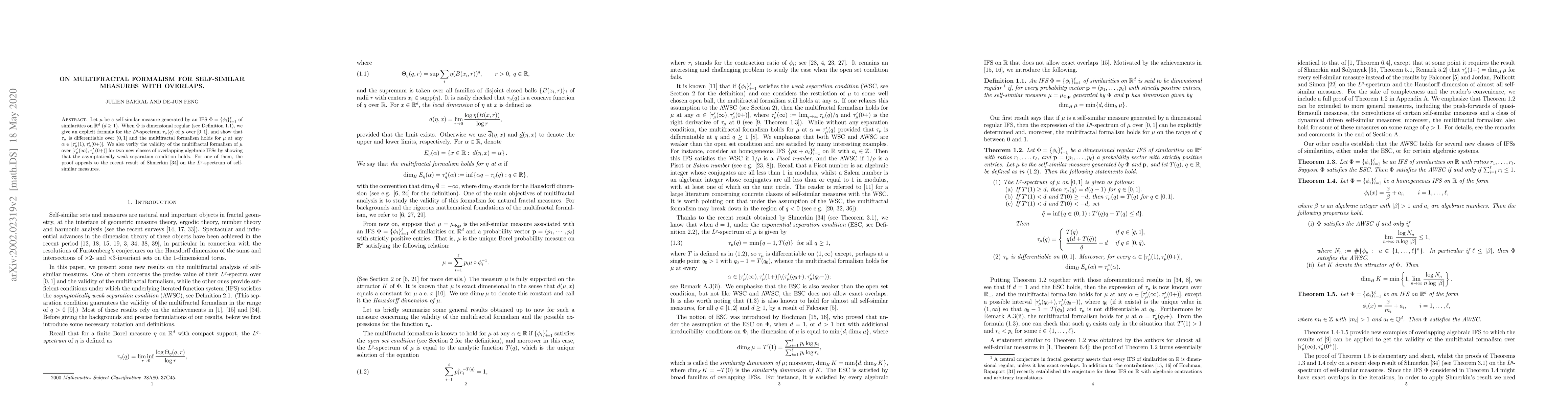 This paper presents an explicit formula for the $L^q$-spectrum of self-similar measures generated by dimensionally regular IFS, demonstrating differentiability and the validity of multifractal formalism. It also verifies the formalism for two new classes of overlapping algebraic IFS under the asymptotically weak separation condition.