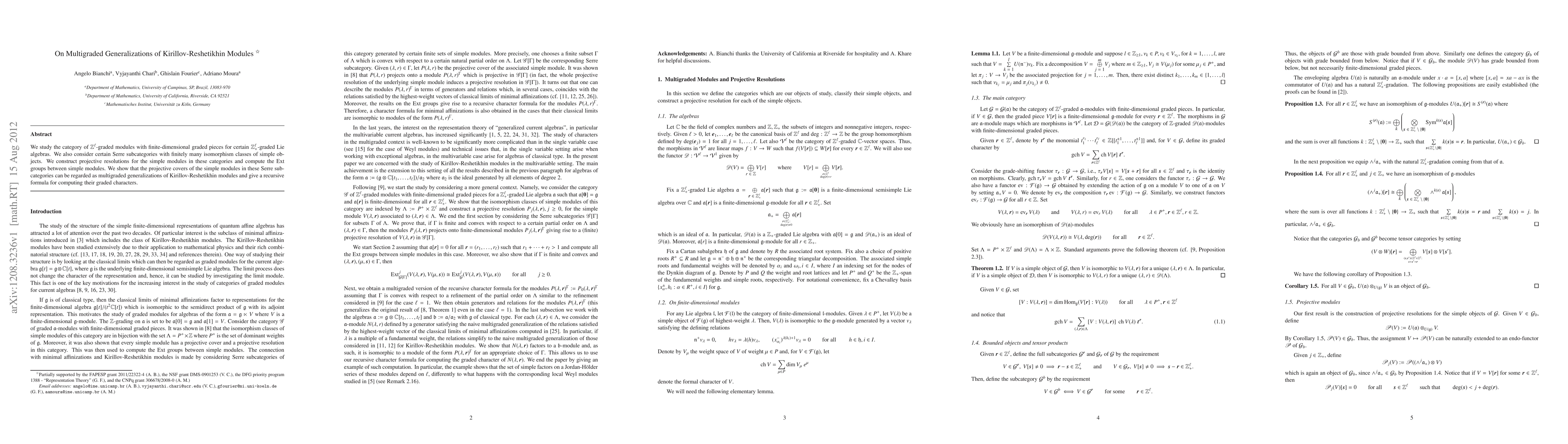 This paper studies multigraded generalizations of Kirillov-Reshetikhin modules in specific Lie algebras, developing projective resolutions for simple modules and computing Ext groups.