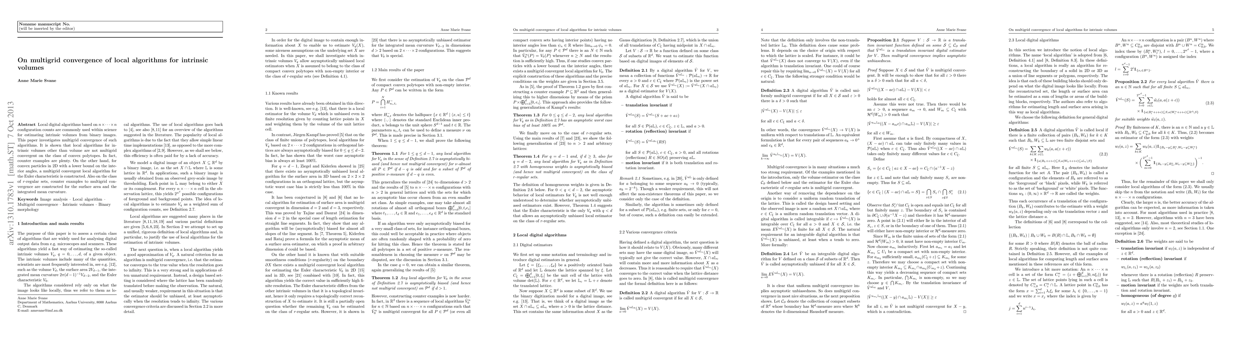 This paper explores the multigrid convergence of local algorithms for estimating intrinsic volumes from binary images, finding that algorithms for volumes other than total volume fail to converge on convex polytopes. However, a multigrid convergent algorithm for the Euler characteristic is developed for convex particles in 2D with minimum interior angles, and counterexamples are presented for surface area and integrated mean curvature on $r$-regular sets.