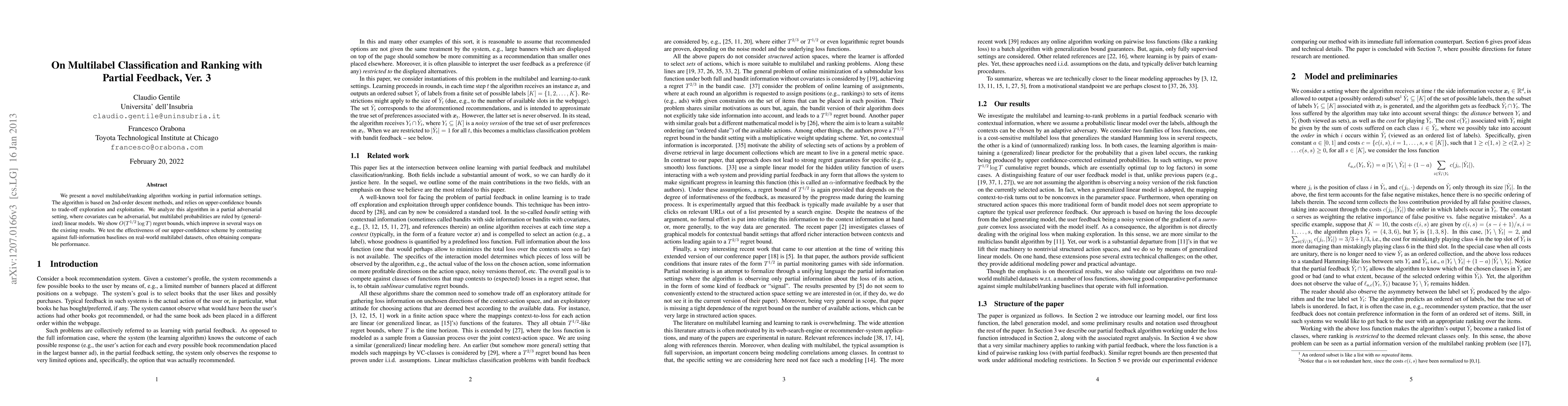 This paper introduces a novel multilabel/ranking algorithm utilizing second-order descent methods and upper-confidence bounds for partial feedback scenarios. It demonstrates improved O(T^{1/2} log T) regret bounds over existing results and shows comparable performance to full-information baselines on real-world datasets.