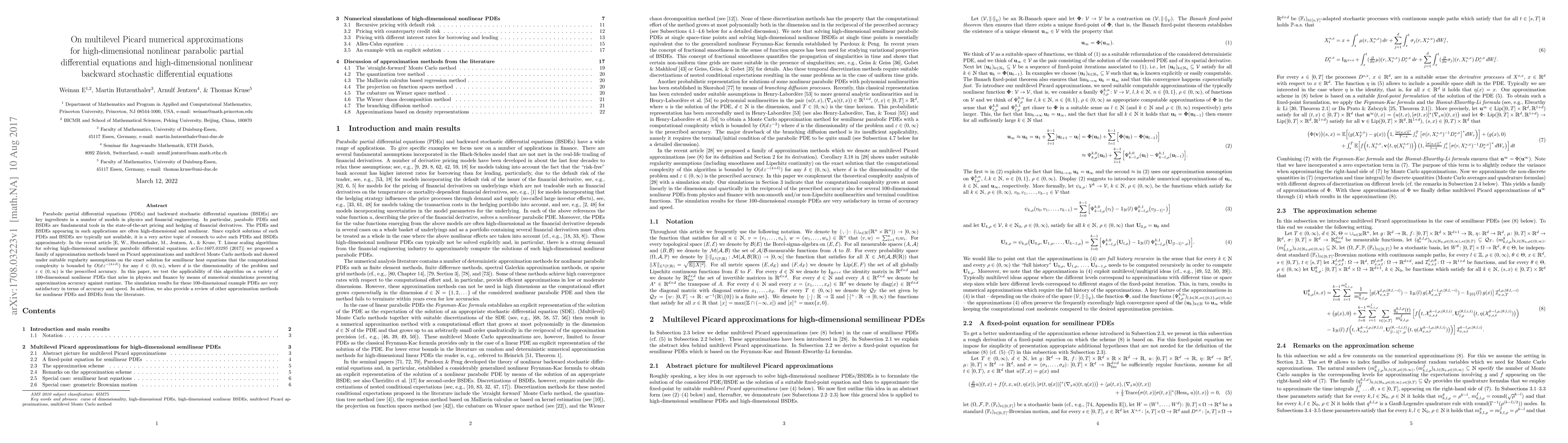 This paper presents a multilevel Picard numerical approximation method for solving high-dimensional nonlinear parabolic PDEs and BSDEs, showing its effectiveness through numerical simulations on 100-dimensional examples, achieving satisfactory accuracy and speed. The study also reviews other approximation methods for these equations.