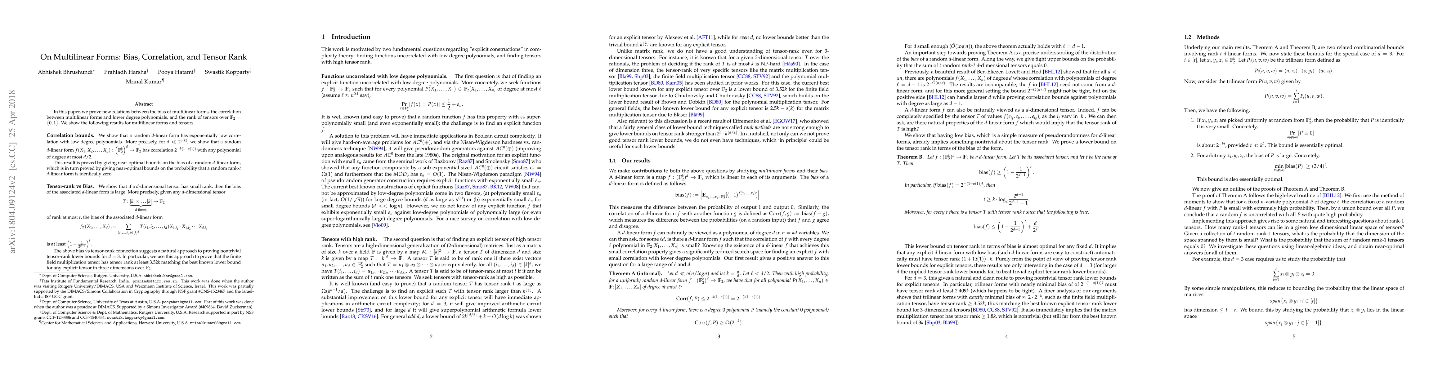 This paper establishes connections between bias in multilinear forms, their correlation with lower-degree polynomials, and tensor rank over GF(2). It proves that random d-linear forms have exponentially low correlation with low-degree polynomials and shows that tensors of small rank yield large biases in associated d-linear forms, ultimately proving a tensor-rank lower bound for finite field multiplication tensors.