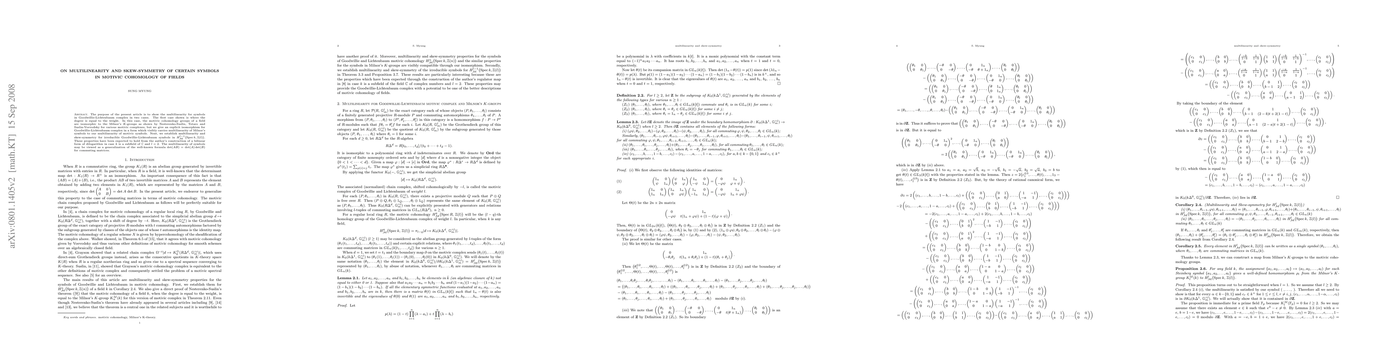 The purpose of the present article is to show the multilinearity for symbols in Goodwillie-Lichtenbaum complex in two cases. The first case shown is where the degree is equal to the weight. In this case, the motivic cohomology groups of a field are isomorphic to the Milnor's K-groups as shown by Nesterenko-Suslin, Totaro and Suslin-Voevodsky for various motivic complexes, but we give an explicit isomorphism for Goodwillie-Lichtenbaum complex in a form which visibly carries multilinearity of Milnor's symbols to our multilinearity of motivic symbols. Next, we establish multilinearity and skew-symmetry for irreducible Goodwillie-Lichtenbaum symbols in H^{l-1} (Spec k, Z(l)). These properties have been expected to hold from the author's construction of a bilinear form of dilogarithm in case k is a subfield of the field of complex numbers and l=2. Next, we establish multilinearity and skew-symmetry for Goodwillie-Lichtenbaum symbols in H^{l-1} (Spec k, Z(l)). These properties have been expected to hold from the author's construction of a bilinear form of dilogarithm in case k is a subfield of the field of complex numbers and l=2. The multilinearity of symbols may be viewed as a generalization of the well-known formula det(AB) = det(A) det(B) for tuples of commuting matrices.