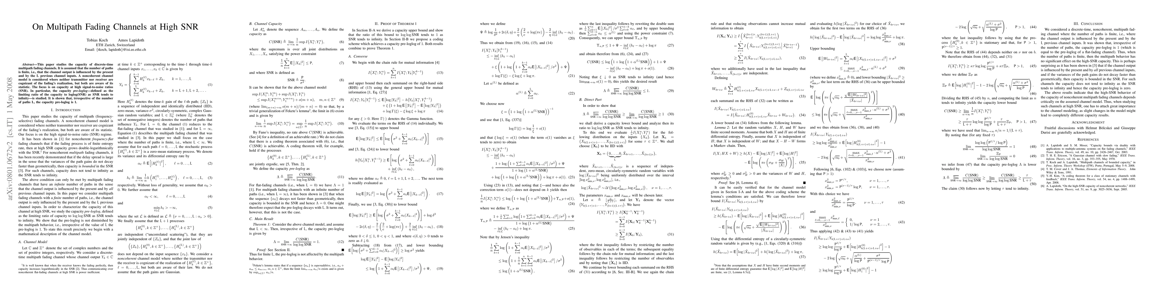 This paper investigates the capacity of discrete-time multipath fading channels at high signal-to-noise ratios (SNR), focusing on noncoherent models where neither transmitter nor receiver is aware of the fading realization but know its statistics. The study reveals that the capacity pre-loglog, defined as the ratio of capacity to loglog SNR as SNR approaches infinity, remains constant at 1 regardless of the number of paths.