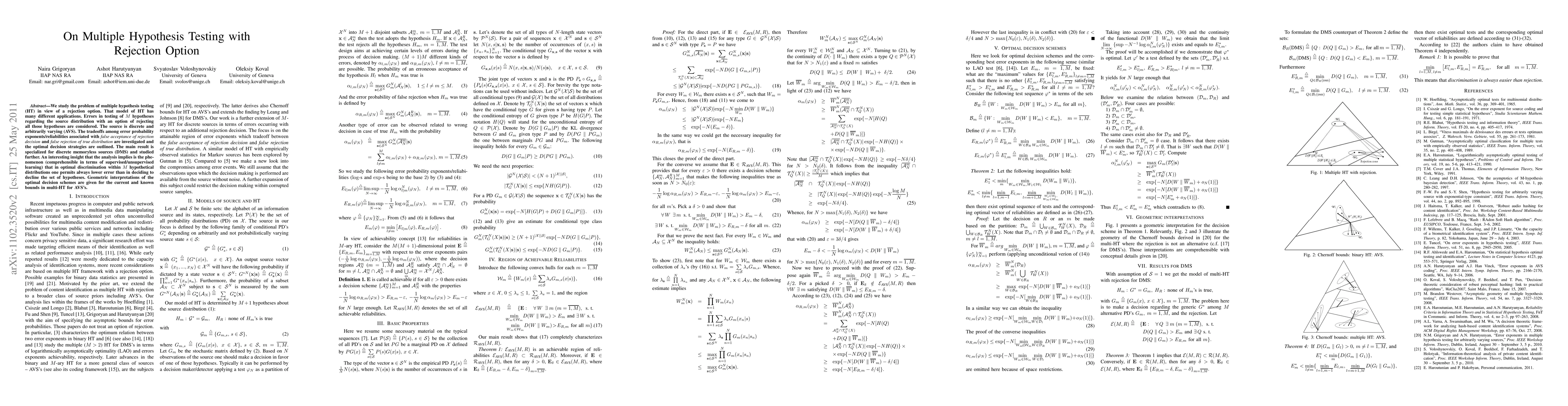 This paper investigates multiple hypothesis testing with a rejection option, focusing on the tradeoffs between error probabilities in testing discrete, arbitrarily varying sources. It outlines optimal decision strategies and reveals that optimal discrimination among hypotheses generally allows for lower error than outright rejection.