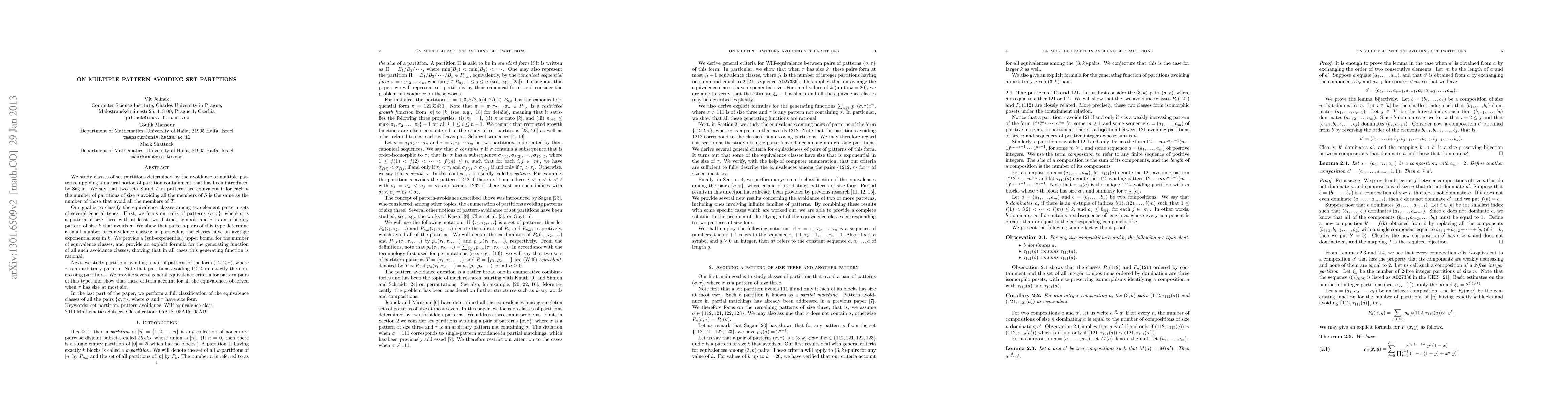 This paper studies set partitions that avoid multiple patterns, focusing on equivalence classes determined by partition containment. It classifies equivalence classes for several types of two-element pattern sets, including those where one pattern is of size three and the other is of size k, and pairs of the form {1212, τ}, providing generating functions and criteria for classification.