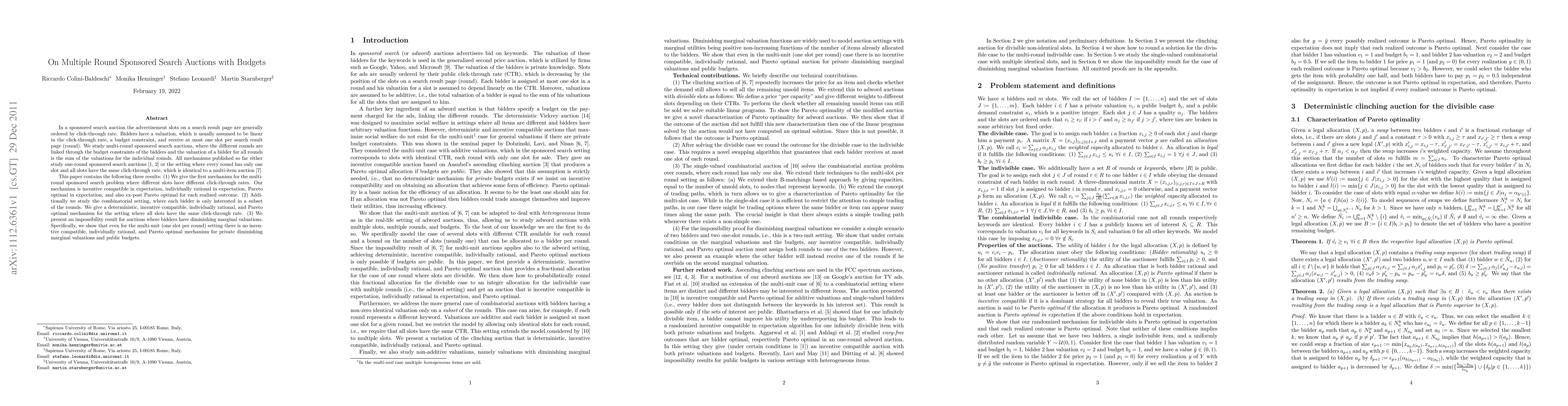 This paper introduces mechanisms for multi-round sponsored search auctions with varying click-through rates and budget constraints. It presents the first incentive-compatible mechanism for different slots, and a deterministic mechanism for combinatorial settings with uniform click-through rates. It also proves the impossibility of achieving optimal outcomes in auctions with diminishing marginal valuations.