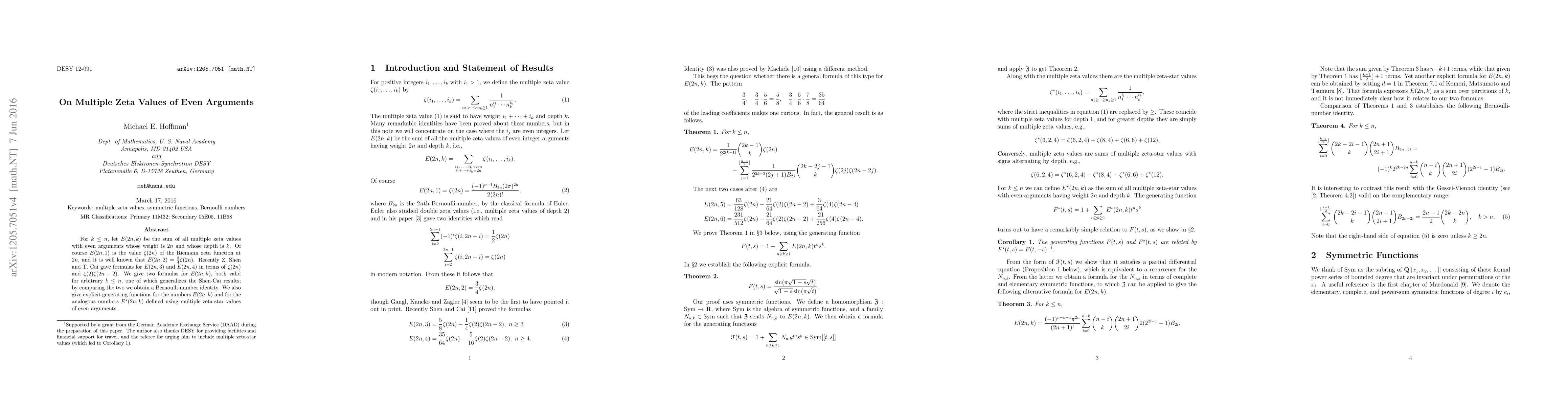 This paper presents new formulas for multiple zeta values of even arguments, specifically E(2n,k), generalizing previous results by Shen and Cai. The study also derives Bernoulli-number identities and provides explicit generating functions for these values and their related multiple zeta-star counterparts.