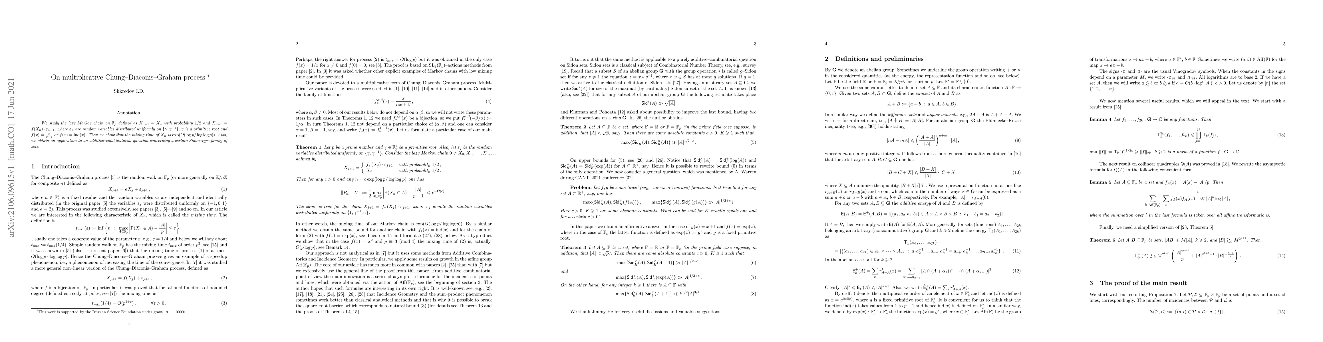 We study the lazy Markov chain on $\mathbf{F}_p$ defined as $X_{n+1}=X_n$ with probability $1/2$ and $X_{n+1}=f(X_n) \cdot \varepsilon_{n+1}$, where $\varepsilon_n$ are random variables distributed uniformly on $\{ \gamma^{}, \gamma^{-1}\}$, $\gamma$ is a primitive root and $f(x) = \frac{x}{x-1}$ or $f(x)=\mathrm{ind} (x)$. Then we show that the mixing time of $X_n$ is $\exp(O(\log p / \log \log p))$. Also, we obtain an application to an additive--combinatorial question concerning a certain Sidon--type family of sets.