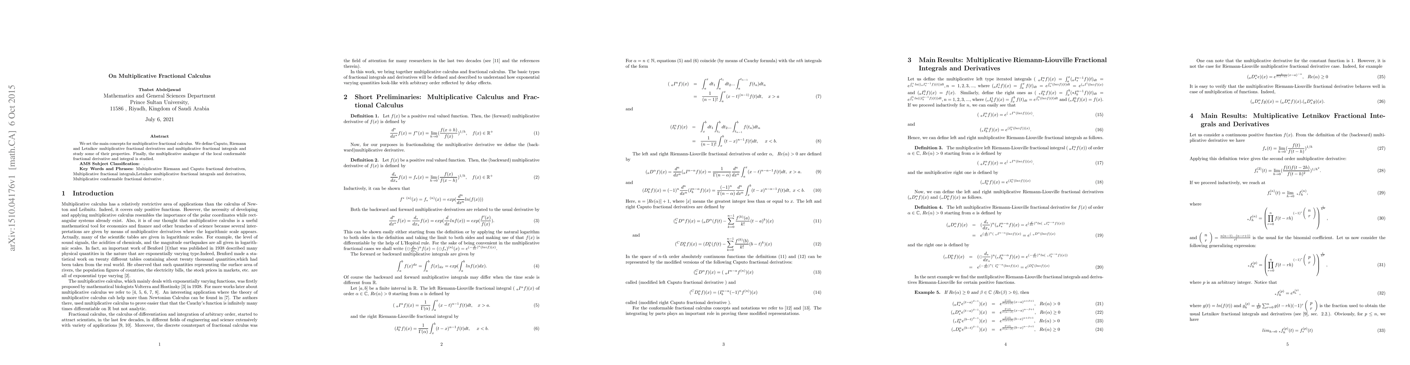 This paper introduces the foundational concepts of multiplicative fractional calculus, defining Caputo, Riemann, and Letnikov multiplicative fractional derivatives and integrals, and explores their properties, including the multiplicative analogue of the local conformable fractional derivative and integral.