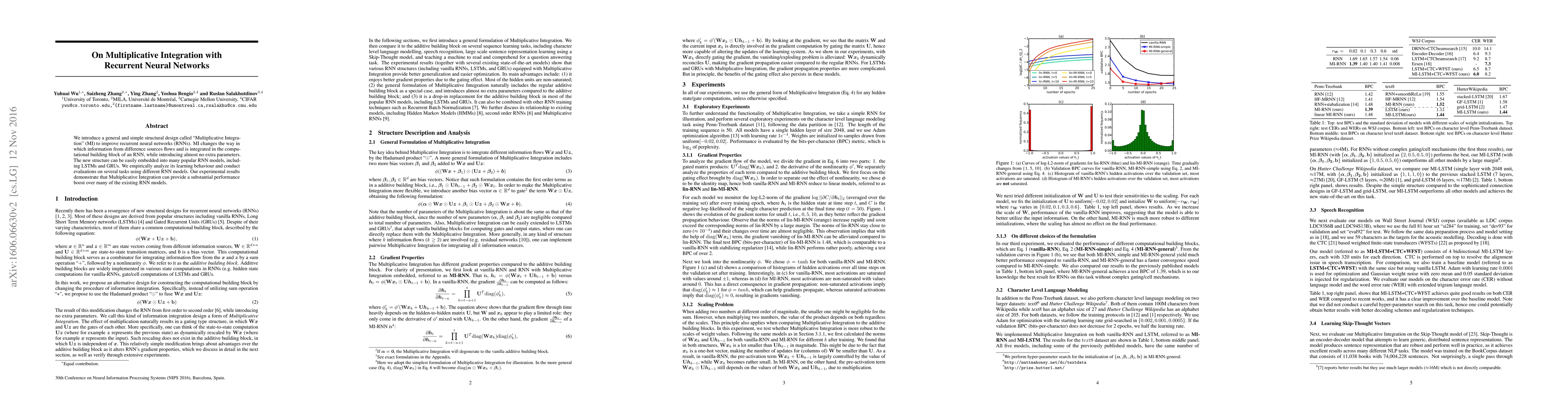 This paper proposes Multiplicative Integration (MI) to enhance recurrent neural networks (RNNs) by altering information flow and integration with minimal additional parameters. Empirical evaluations show that MI can significantly outperform existing RNN models, including LSTMs and GRUs, across various tasks.