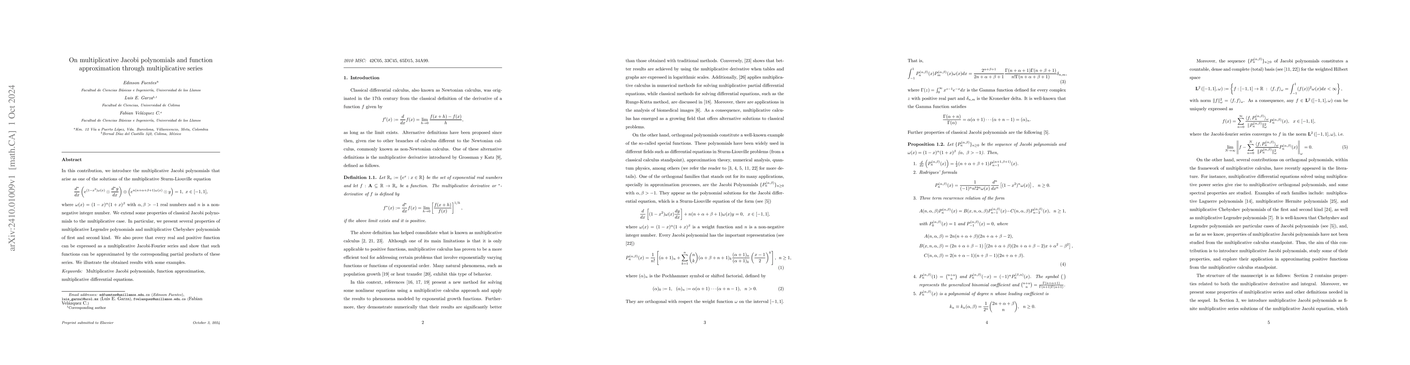 This paper introduces multiplicative Jacobi polynomials, which solve a multiplicative Sturm-Liouville equation, and extends properties of classical Jacobi polynomials to this multiplicative framework. It demonstrates that any positive real function can be expressed as a multiplicative Jacobi-Fourier series and approximated by its partial sums.