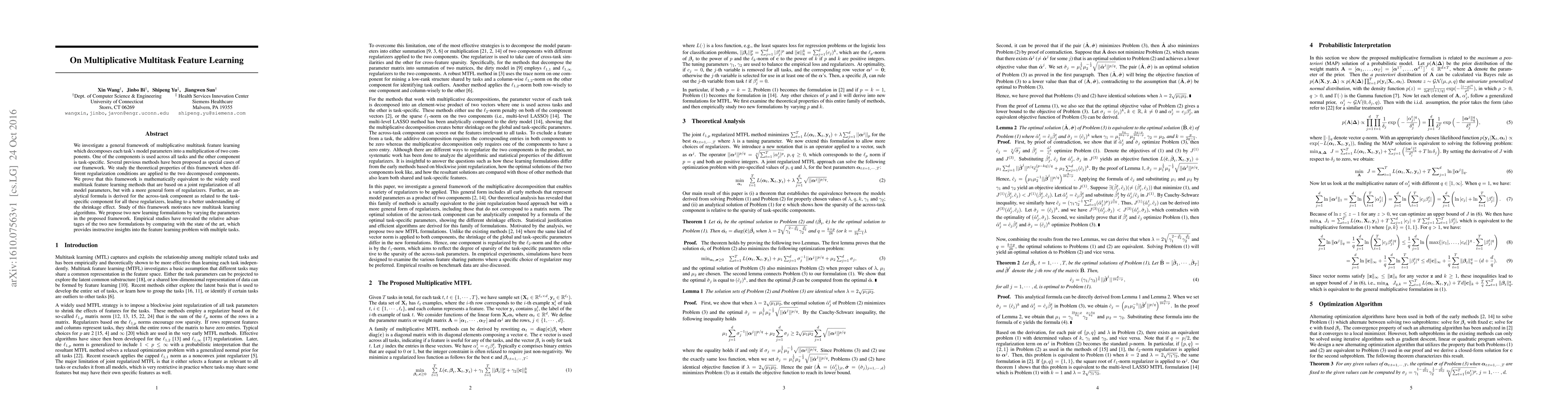 This paper proposes a multiplicative multitask feature learning framework that decomposes task parameters into a shared and a task-specific component, offering a more general form of regularization. The framework is shown to be equivalent to joint regularization methods, and new algorithms derived from the framework outperform existing state-of-the-art methods.