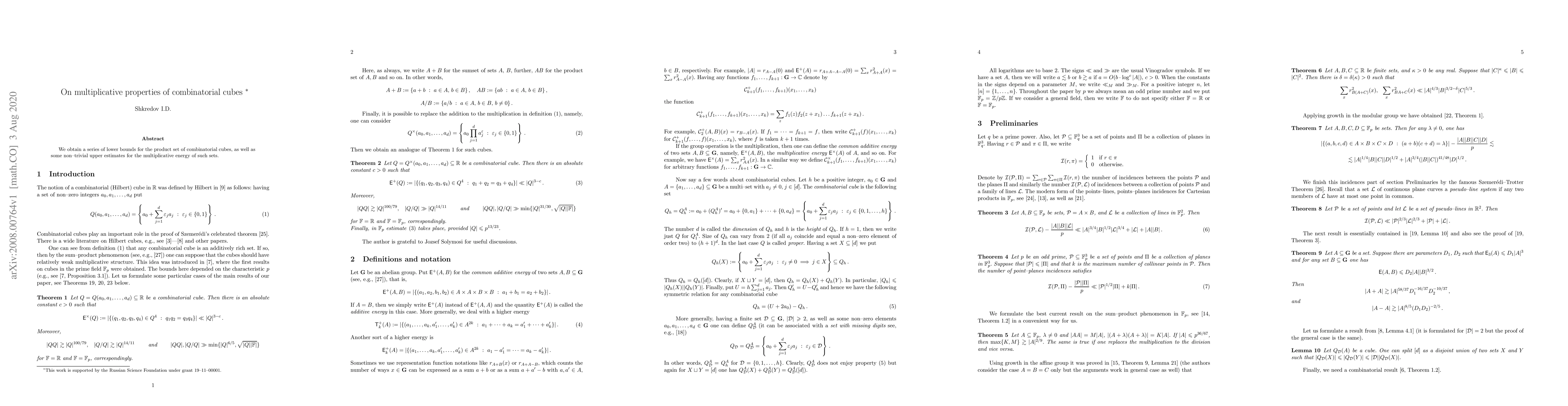 This paper establishes lower bounds for the product set of combinatorial cubes and provides non-trivial upper estimates for their multiplicative energy, contributing to the understanding of their multiplicative properties.
