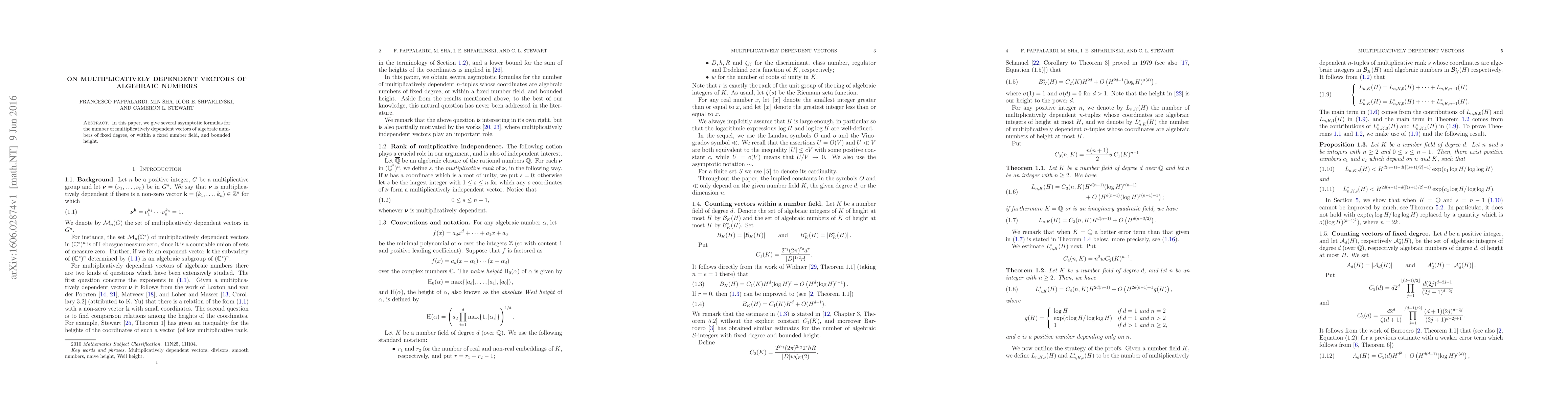 Summary: This paper provides asymptotic formulas for the count of multiplicatively dependent vectors composed of algebraic numbers, focusing on those of a fixed degree or within a specified number field, and constrained by a bounded height.