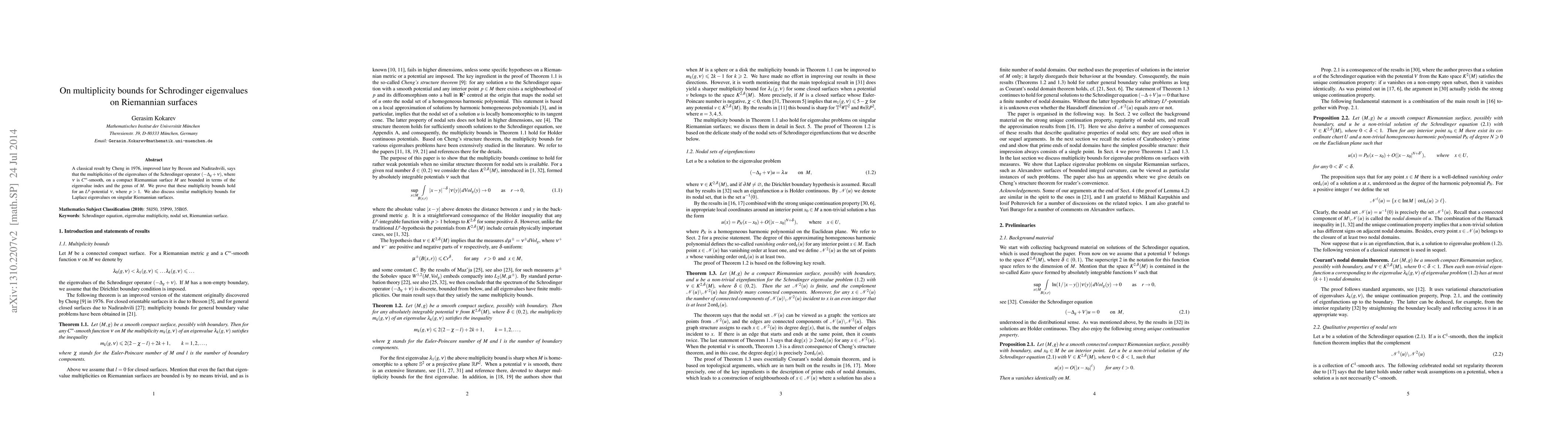 A classical result by Cheng in 1976, improved later by Besson and Nadirashvili, says that the multiplicities of the eigenvalues of the Schrodinger operator with a smooth potential on a compact Riemannian surface M are bounded in terms of the eigenvalue index and the genus of M. We prove that these multiplicity bounds hold for an L^p-potential, where p>1. We also discuss similar multiplicity bounds for Laplace eigenvalues on singular Riemannian surfaces.
