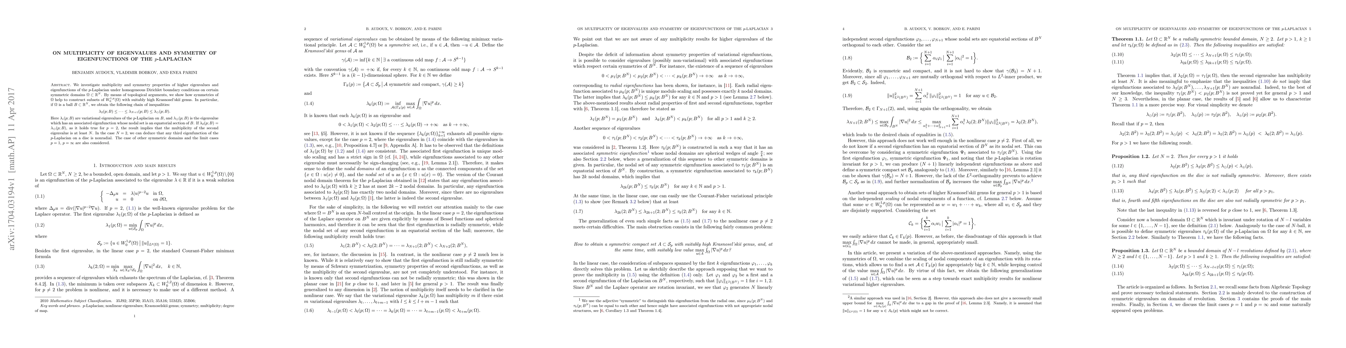 This paper explores the multiplicity and symmetry of eigenvalues and eigenfunctions of the $p$-Laplacian under Dirichlet boundary conditions, leveraging topological arguments to demonstrate how domain symmetries influence eigenfunction properties. For balls in $\mathbb{R}^N$, it establishes a chain of inequalities for eigenvalues and deduces specific symmetry and multiplicity results, including the nonradial nature of third eigenfunctions in discs for $p=2$.
