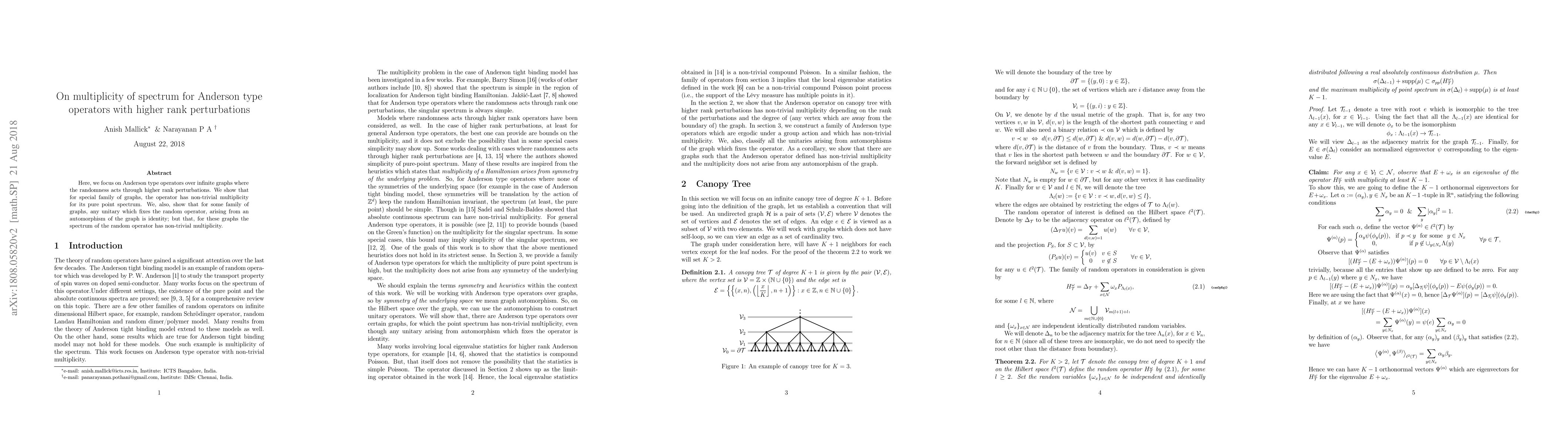Researchers found that certain Anderson type operators with higher rank perturbations can have non-trivial multiplicity in their pure point spectrum, even when fixed by unitary automorphisms of the underlying graph.