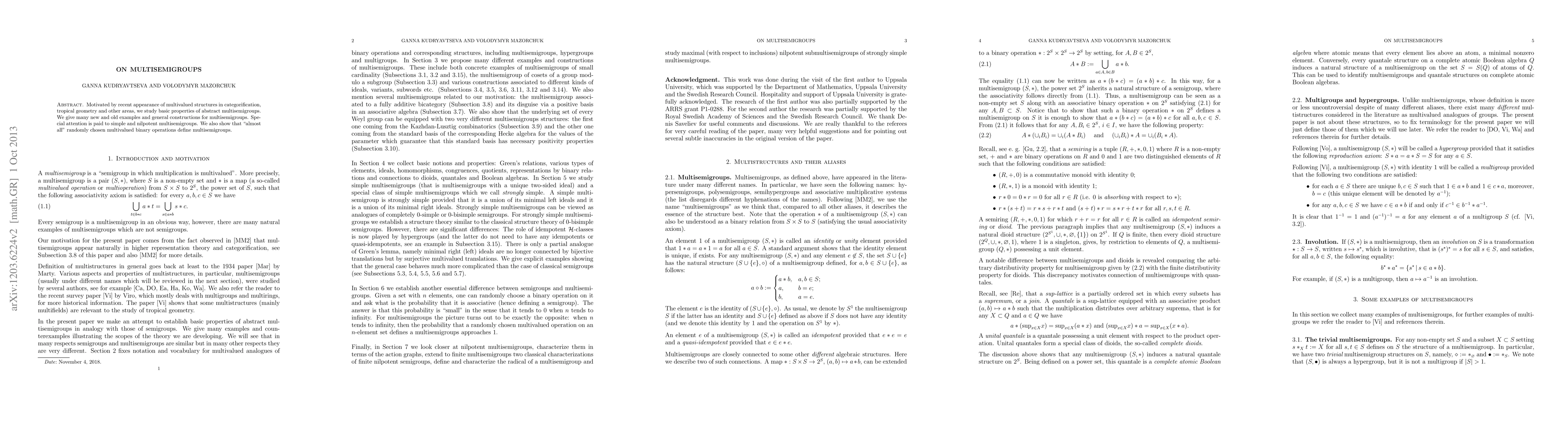 This paper explores the fundamental properties of abstract multisemigroups, providing numerous examples and constructions, with a focus on simple and nilpotent types, and demonstrates that most randomly chosen multivalued binary operations naturally form multisemigroups.