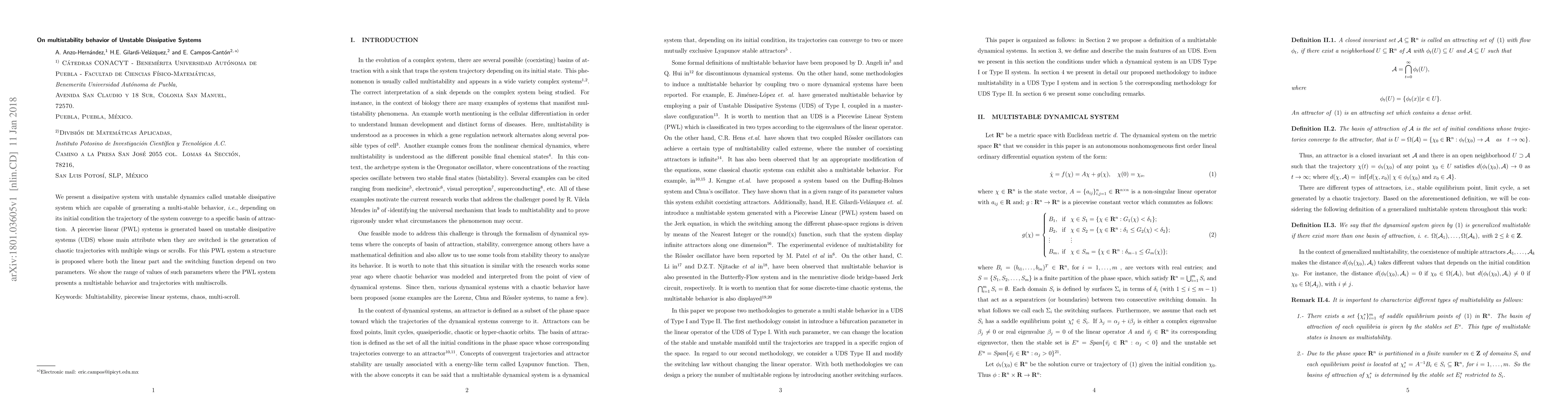 We present a dissipative system with unstable dynamics called unstable dissipative system which are capable of generating a multi-stable behavior, i.e., depending on its initial condition the trajectory of the system converge to a specific basin of attraction. A piecewise linear (PWL) systems is generated based on unstable dissipative systems (UDS) whose main attribute when they are switched is the generation of chaotic trajectories with multiple wings or scrolls. For this PWL system a structure is proposed where both the linear part and the switching function depend on two parameters. We show the range of values of such parameters where the PWL system presents a multistable behavior and trajectories with multiscrolls.