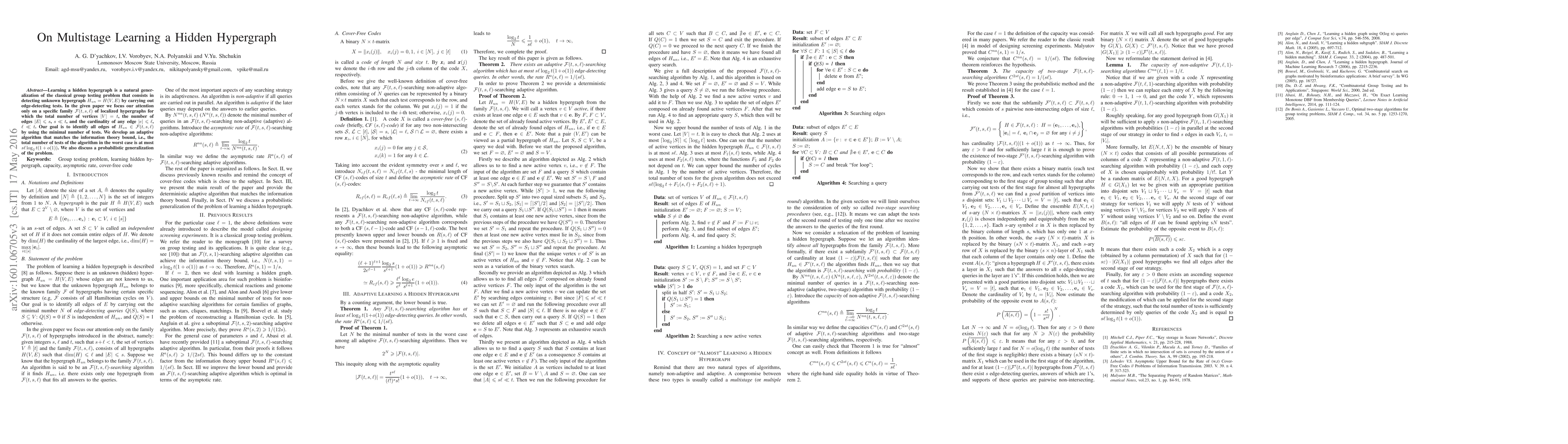 This paper develops an adaptive algorithm to identify edges in a specific family of hidden hypergraphs using the minimal number of tests, achieving a performance that matches the information theory bound. The paper also explores a probabilistic generalization of the problem.
