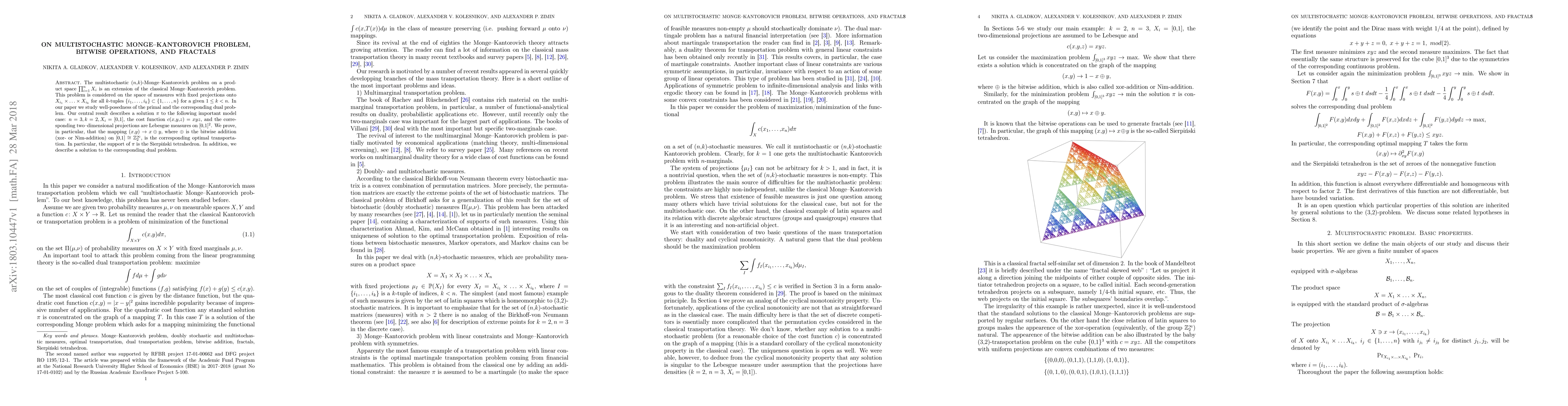 This paper investigates the multistochastic Monge-Kantorovich problem for $n=3$ and $k=2$ on $[0,1]$, proving that bitwise addition (xor- or Nim-addition) is the optimal transportation. The solution's support is the Sierpiński tetrahedron, and the authors also address the well-posedness of the dual problem.