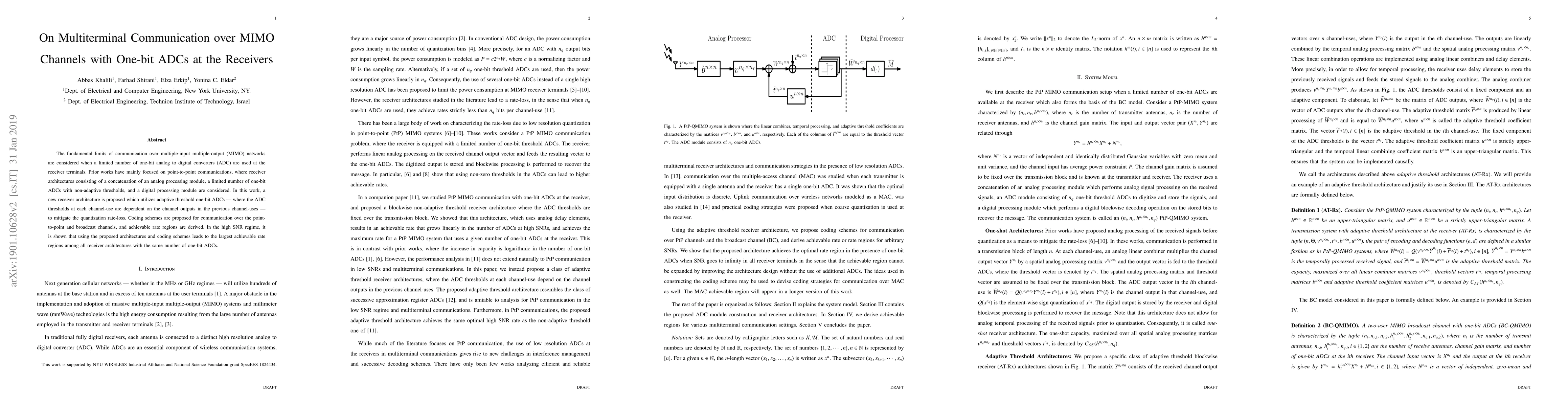 This paper investigates the communication limits in MIMO networks with one-bit ADCs at receivers, proposing a new adaptive threshold ADC architecture to mitigate quantization loss. It achieves the largest achievable rate regions in the high SNR regime compared to other architectures.