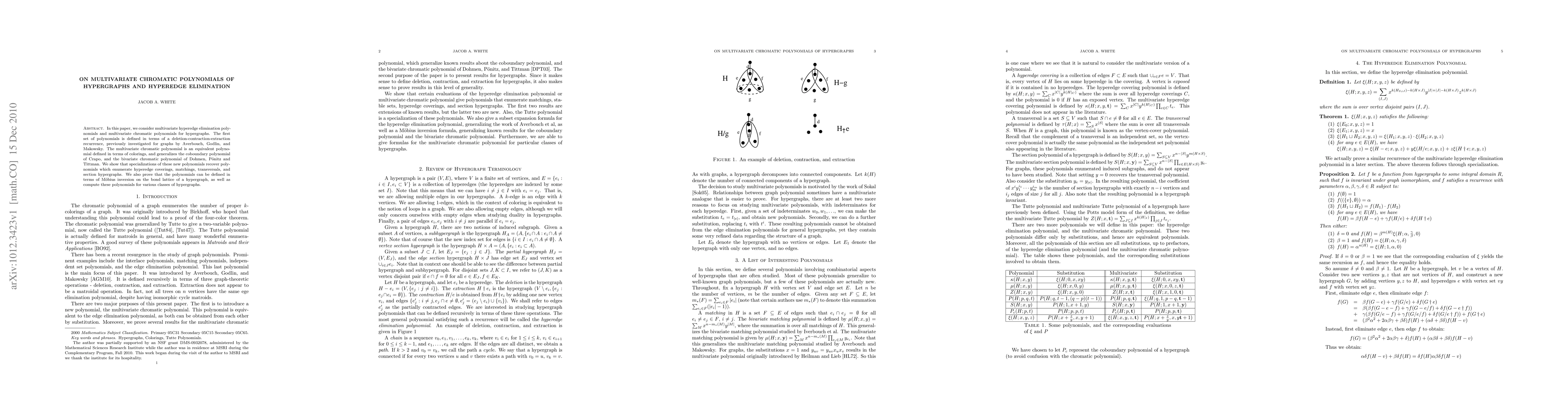 This paper introduces multivariate hyperedge elimination polynomials and multivariate chromatic polynomials for hypergraphs, establishing their equivalence and defining them via a deletion-contraction-extraction recurrence. It demonstrates that these polynomials enumerate hyperedge coverings, matchings, transversals, and section hypergraphs upon specialization.