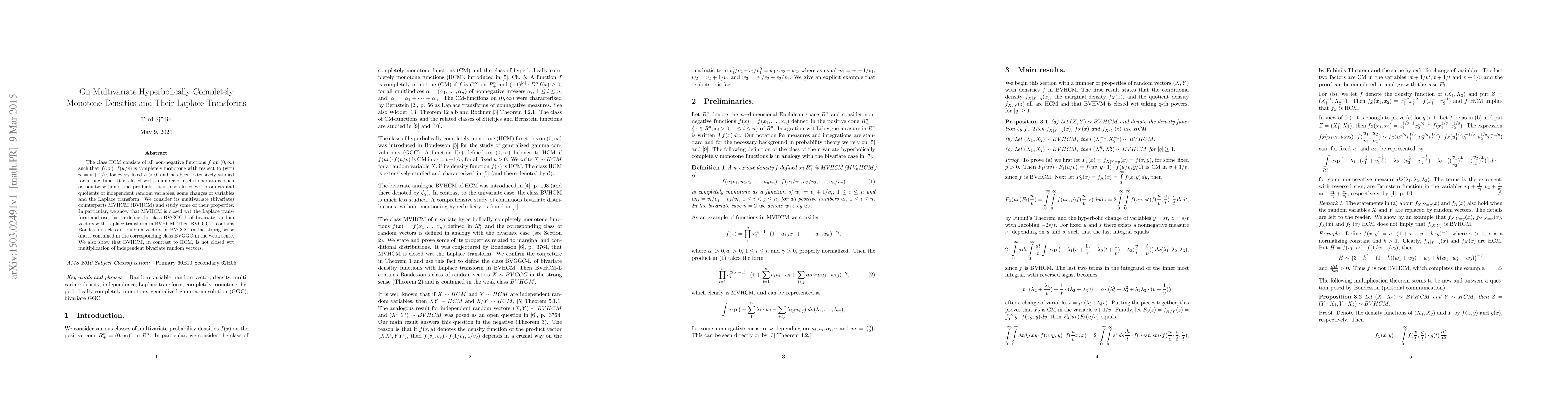 The class HCM consists of all nonnegative functions f such that f(uv)*f(u/v)is completely monotone with respect to w=v+1/v, for all fixed positive numbers u, and has been extensively studied for a long time. It is closed with respect to (wr) a number of useful operations such as products and quotients of independent random variables, some changes of variables and the Laplace transform. We consider its multivariate (bivariateI counterparts MVHCM (BVHCM) and study some of their properties. In particular, we prove that MVHCM is closed wrt the Laplace transform and use this to define a class BVHCM-L of bivariate random vectors having this property. Then BVHCM-L contains Bondesson's class of random vectors in BVHCM in the strong sense. Finally, we show that BVHCM, in contrast to HCM, is not closed wrt multiplication of independent bivariate random vectors.