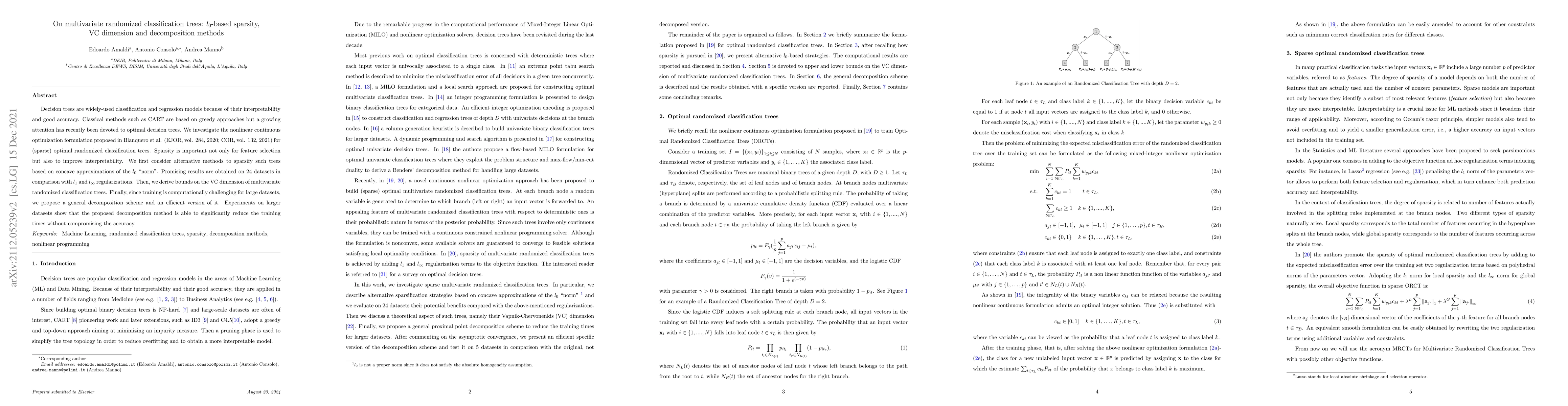 Decision trees are widely-used classification and regression models because of their interpretability and good accuracy. Classical methods such as CART are based on greedy approaches but a growing attention has recently been devoted to optimal decision trees. We investigate the nonlinear continuous optimization formulation proposed in Blanquero et al. (EJOR, vol. 284, 2020; COR, vol. 132, 2021) for (sparse) optimal randomized classification trees. Sparsity is important not only for feature selection but also to improve interpretability. We first consider alternative methods to sparsify such trees based on concave approximations of the $l_{0}$ ``norm". Promising results are obtained on 24 datasets in comparison with $l_1$ and $l_{\infty}$ regularizations. Then, we derive bounds on the VC dimension of multivariate randomized classification trees. Finally, since training is computationally challenging for large datasets, we propose a general decomposition scheme and an efficient version of it. Experiments on larger datasets show that the proposed decomposition method is able to significantly reduce the training times without compromising the accuracy.