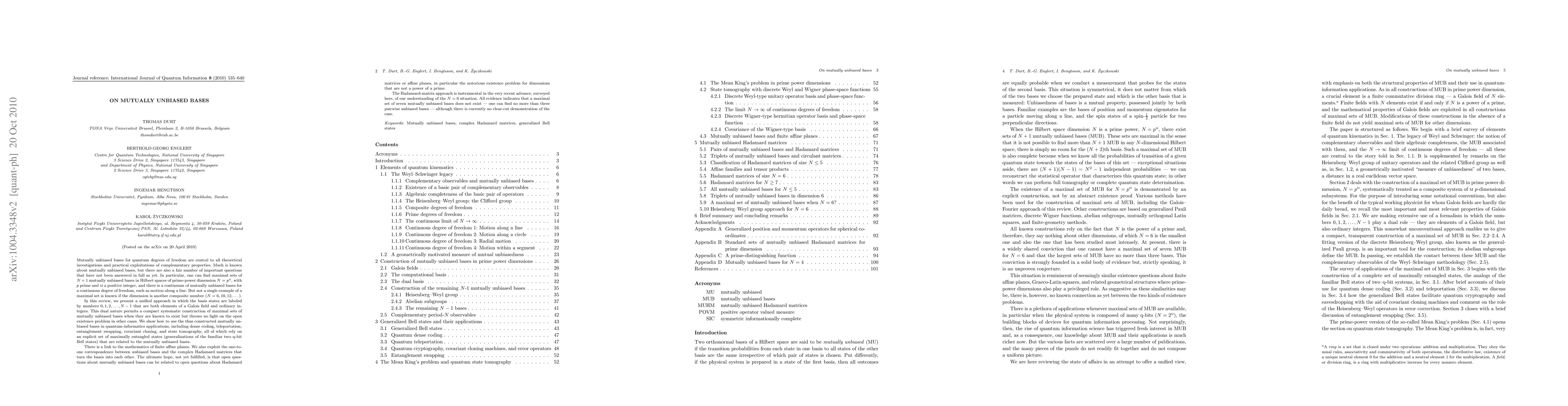 Mutually unbiased bases for quantum degrees of freedom are central to all theoretical investigations and practical exploitations of complementary properties. Much is known about mutually unbiased bases, but there are also a fair number of important questions that have not been answered in full as yet. In particular, one can find maximal sets of ${N+1}$ mutually unbiased bases in Hilbert spaces of prime-power dimension ${N=p^\m}$, with $p$ prime and $\m$ a positive integer, and there is a continuum of mutually unbiased bases for a continuous degree of freedom, such as motion along a line. But not a single example of a maximal set is known if the dimension is another composite number ($N=6,10,12,...$). In this review, we present a unified approach in which the basis states are labeled by numbers ${0,1,2,...,N-1}$ that are both elements of a Galois field and ordinary integers. This dual nature permits a compact systematic construction of maximal sets of mutually unbiased bases when they are known to exist but throws no light on the open existence problem in other cases. We show how to use the thus constructed mutually unbiased bases in quantum-informatics applications, including dense coding, teleportation, entanglement swapping, covariant cloning, and state tomography, all of which rely on an explicit set of maximally entangled states (generalizations of the familiar two--q-bit Bell states) that are related to the mutually unbiased bases. There is a link to the mathematics of finite affine planes. We also exploit the one-to-one correspondence between unbiased bases and the complex Hadamard matrices that turn the bases into each other. The ultimate hope, not yet fulfilled, is that open questions about mutually unbiased bases can be related to open questions about Hadamard matrices or affine planes, in particular the ...[rest deleted]