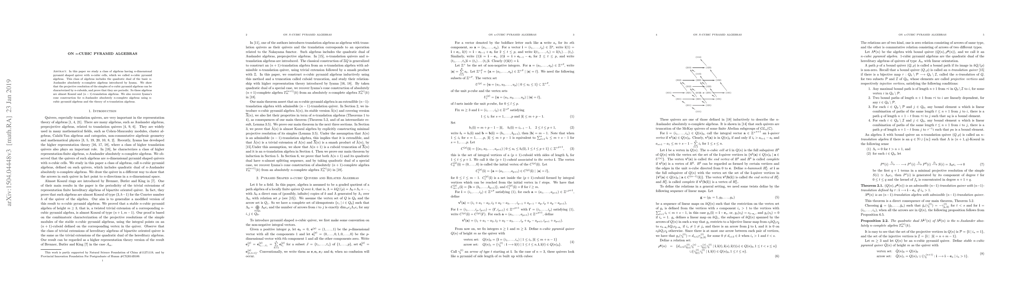 In this paper we study a class of algebras having $n$-dimensional pyramid shaped quiver with $n$-cubic cells, which we called $n$-cubic pyramid algebras. This class of algebras includes the quadratic dual of the basic $n$-Auslander absolutely $n$-complete algebras introduced by Iyama. We show that the projective resolution of the simples of $n$-cubic pyramid algebras can be characterized by $n$-cuboids, and prove that they are periodic. So these algebras are almost Koszul and $(n-1)$-translation algebras. We also recover Iyama's cone construction for $n$-Auslander absolutely $n$-complete algebras using $n$-cubic pyramid algebras and the theory of $n$-translation algebras.