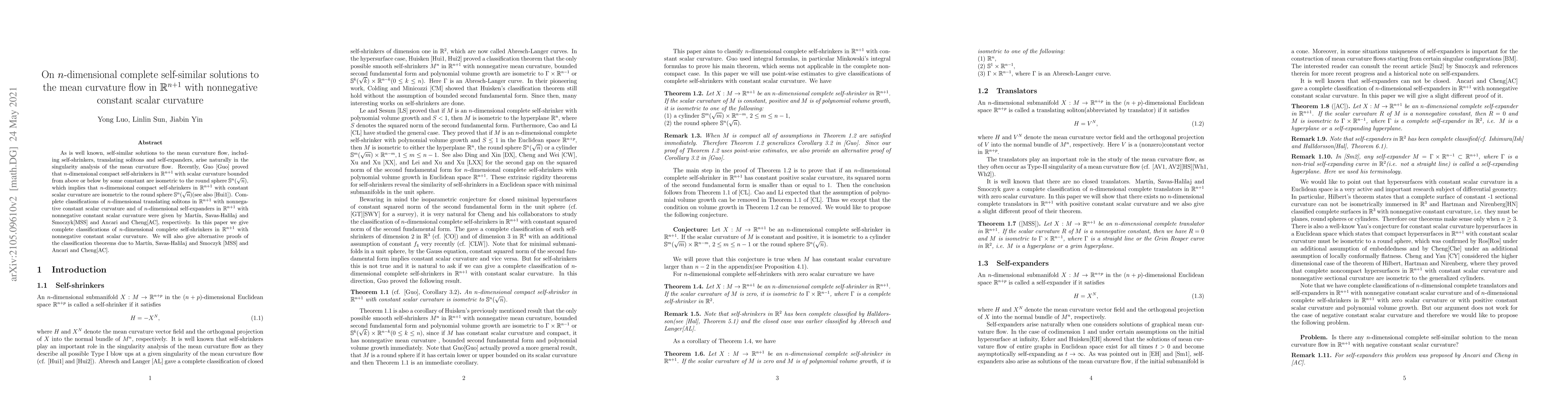 As is well known, self-similar solutions to the mean curvature flow, including self-shrinkers, translating solitons and self-expanders, arise naturally in the singularity analysis of the mean curvature flow. Recently, Guo \cite{Guo} proved that $n$-dimensional compact self-shrinkers in $\mathbb{R}^{n+1}$ with scalar curvature bounded from above or below by some constant are isometric to the round sphere $\mathbb{S}^n(\sqrt{n})$, which implies that $n$-dimensional compact self-shrinkers in $\mathbb{R}^{n+1}$ with constant scalar curvature are isometric to the round sphere $\mathbb{S}^n(\sqrt{n})$(see also \cite{Hui1}). Complete classifications of $n$-dimensional translating solitons in $\mathbb{R}^{n+1}$ with nonnegative constant scalar curvature and of $n$-dimensional self-expanders in $\mathbb{R}^{n+1}$ with nonnegative constant scalar curvature were given by Mart\'{i}n, Savas-Halilaj and Smoczyk\cite{MSS} and Ancari and Cheng\cite{AC}, respectively. In this paper we give complete classifications of $n$-dimensional complete self-shrinkers in $\mathbb{R}^{n+1}$ with nonnegative constant scalar curvature. We will also give alternative proofs of the classification theorems due to Mart\'{i}n, Savas-Halilaj and Smoczyk \cite{MSS} and Ancari and Cheng\cite{AC}.