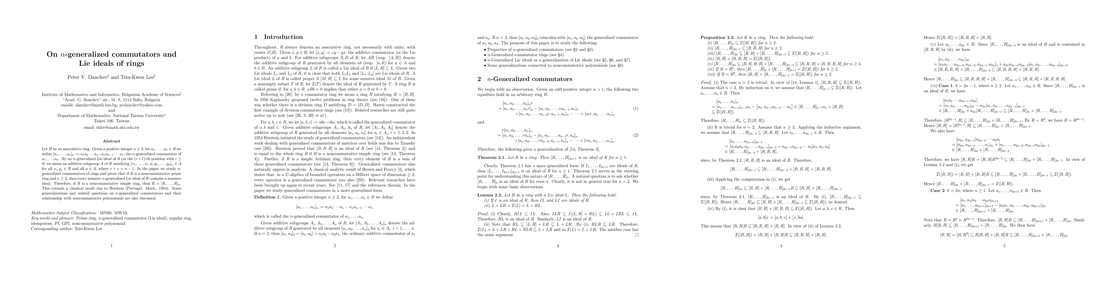 This paper investigates n-generalized commutators in associative rings, proving that in noncommutative prime rings with n > 2, every nonzero n-generalized Lie ideal contains a nonzero ideal. It extends Herstein's classical result and explores related questions on n-generalized commutators and their connection to noncommutative polynomials.