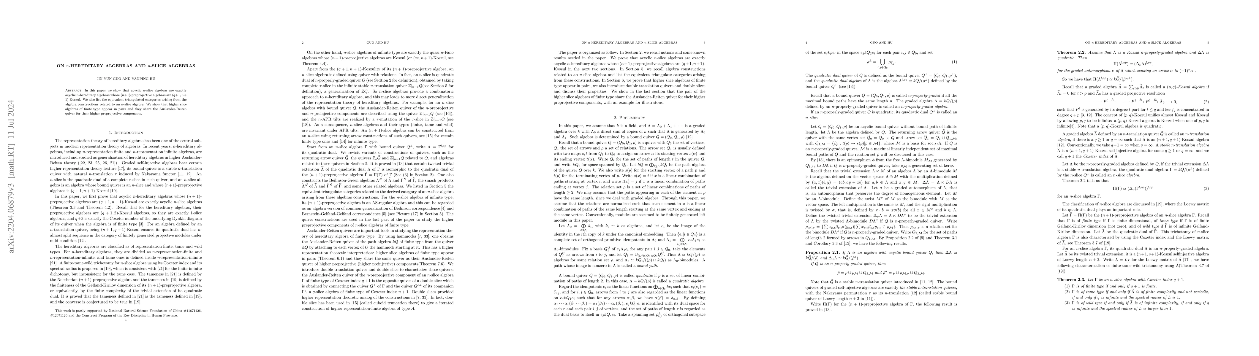This paper establishes that acyclic $n$-slice algebras are equivalent to acyclic $n$-hereditary algebras with $(n+1)$-preprojective algebras that are $(q+1,n+1)$-Koszul. It also identifies the triangulated categories associated with these algebra constructions and demonstrates that higher slice algebras of finite type occur in pairs sharing the Auslander-Reiten quiver.